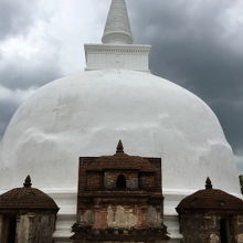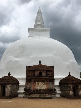 南の方から進んで行くと、遺跡らしい茶色っぽい色が続きますが、突然の様に真っ白な塔が目に入ってきます。キリ・ヴィハーラのキリとはミルクの意味だそうで、これは乳白色の寺院という意味とのことです。なるほどと納得したのですが、この乳白色には近年の修復によるものだそうで、ちょっとがっかりです。また、今まで、綺麗なカーブをしたものを見てきましたが、これはちょっと凸凹としています。