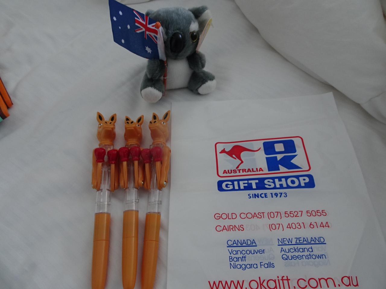 ボクサーカンガルーボールペンが欲しくて、他にもコアラが飛ぶボールペンなどもありました。ゴールドコーストでもらったVOUCHERBOOK(マガジンクーポン)小冊子を見せて10ドル以上買うと、コアラのぬいぐるみをくれました。