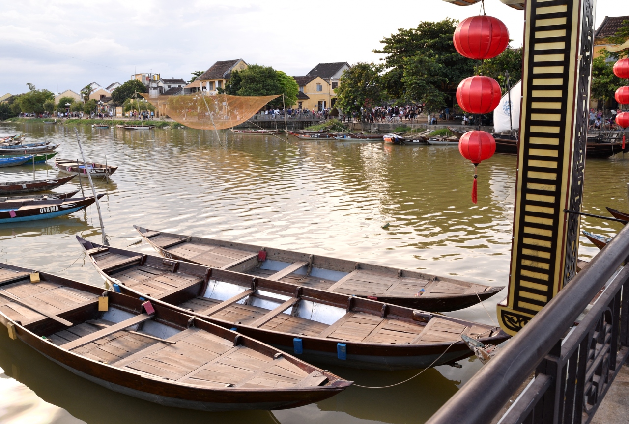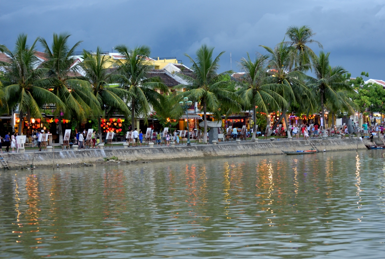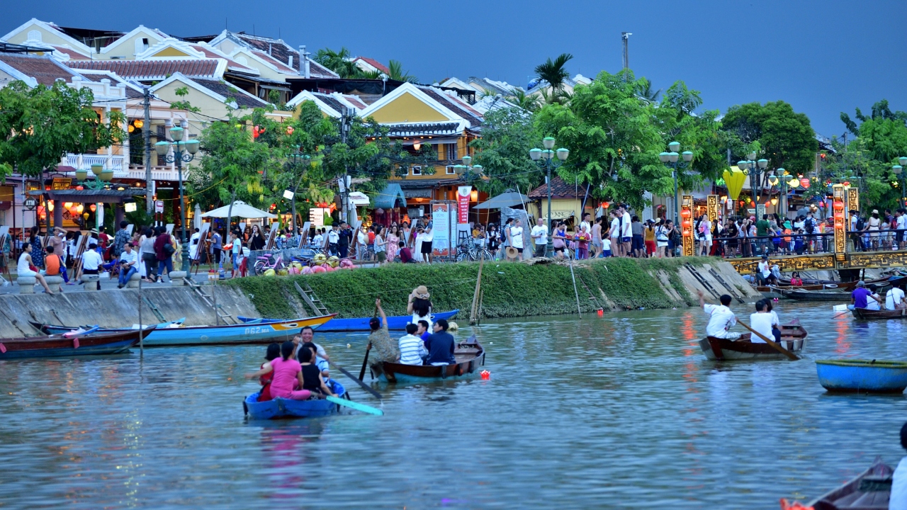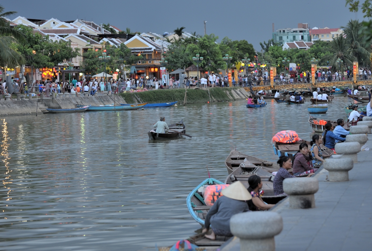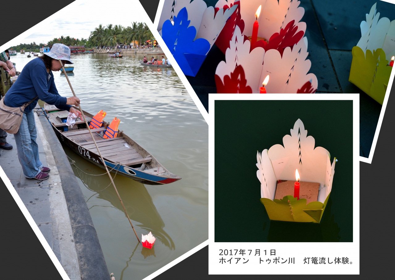 竿の先の小さな篭に、ろうそくに火をつけた紙でできた灯篭を乗せ、トゥポン川に静かに流します。あちらこちらで灯篭流しが始まります。船に乗りトゥポン川を楽しむ人や川岸を散歩する人など、様々に観光客がホイアンを楽しんでいます。