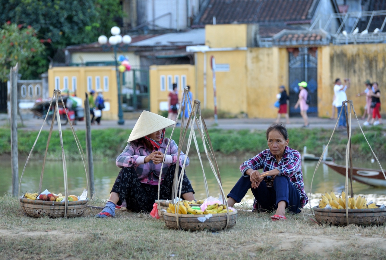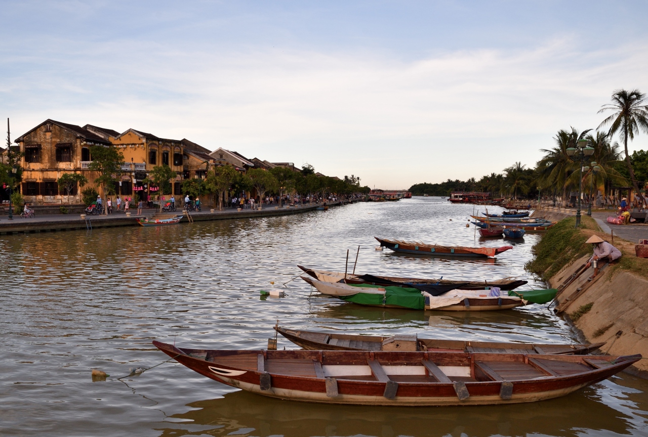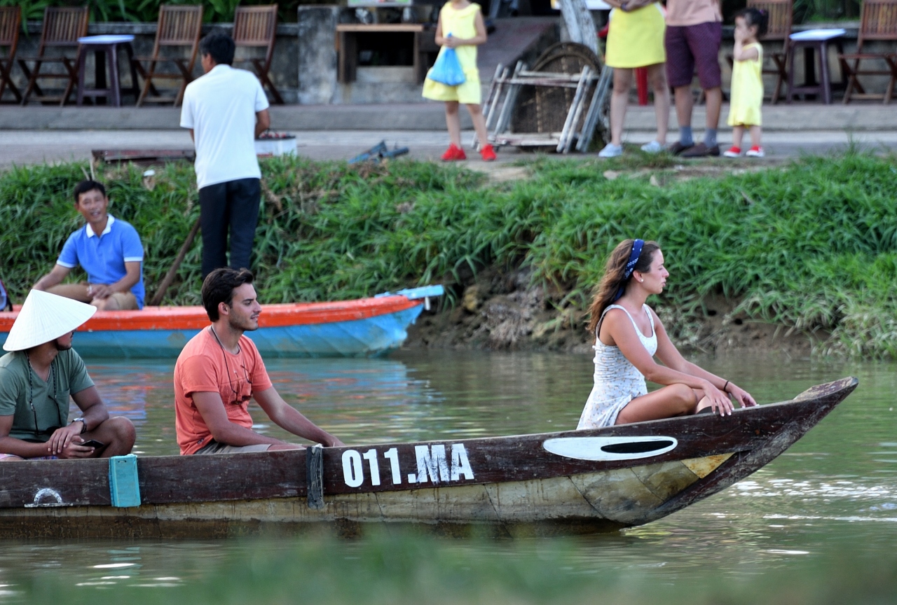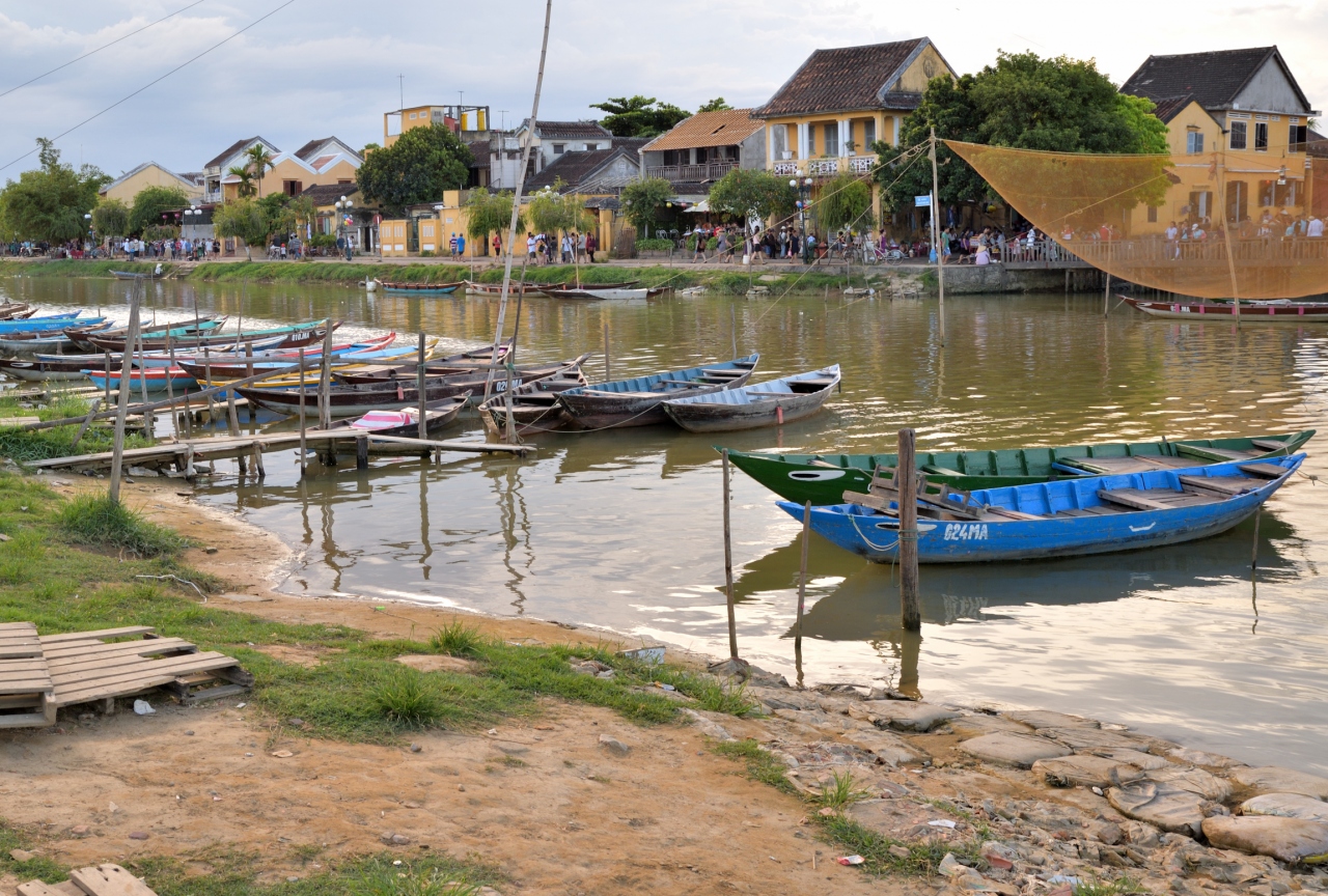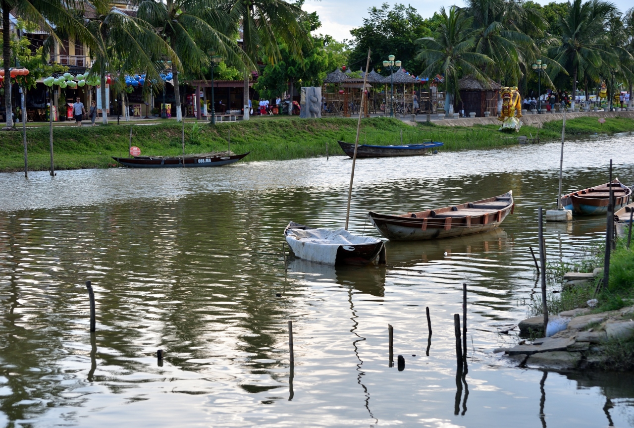 竿の先の小さな篭に、ろうそくに火をつけた紙でできた灯篭を乗せ、トゥポン川に静かに流します。あちらこちらで灯篭流しが始まります。船に乗りトゥポン川を楽しむ人や川岸を散歩する人など、様々に観光客がホイアンを楽しんでいます。