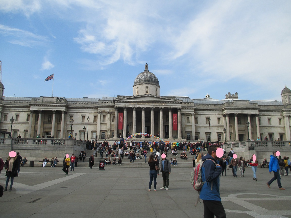 トラファルガー広場は、とても賑やかです。まわりに、ナショナルギャラリー、ネルソン提督の記念柱、ライオン像などがあり、観光客で賑わっています。また、ロンドンの中心地にあるので、ここから、ビッグベン、バッキンガム宮殿などへも近いです。