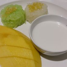 マンゴーともち米のデザートを50バーツで食べました。8月は旬ではないにも関わらず、甘くてとっても美味しかったです。もち米も程よい塩加減と硬さで、苦手なミルクが別皿だったのもポイント高いです。食事後のデザートに最適な量だと思います。