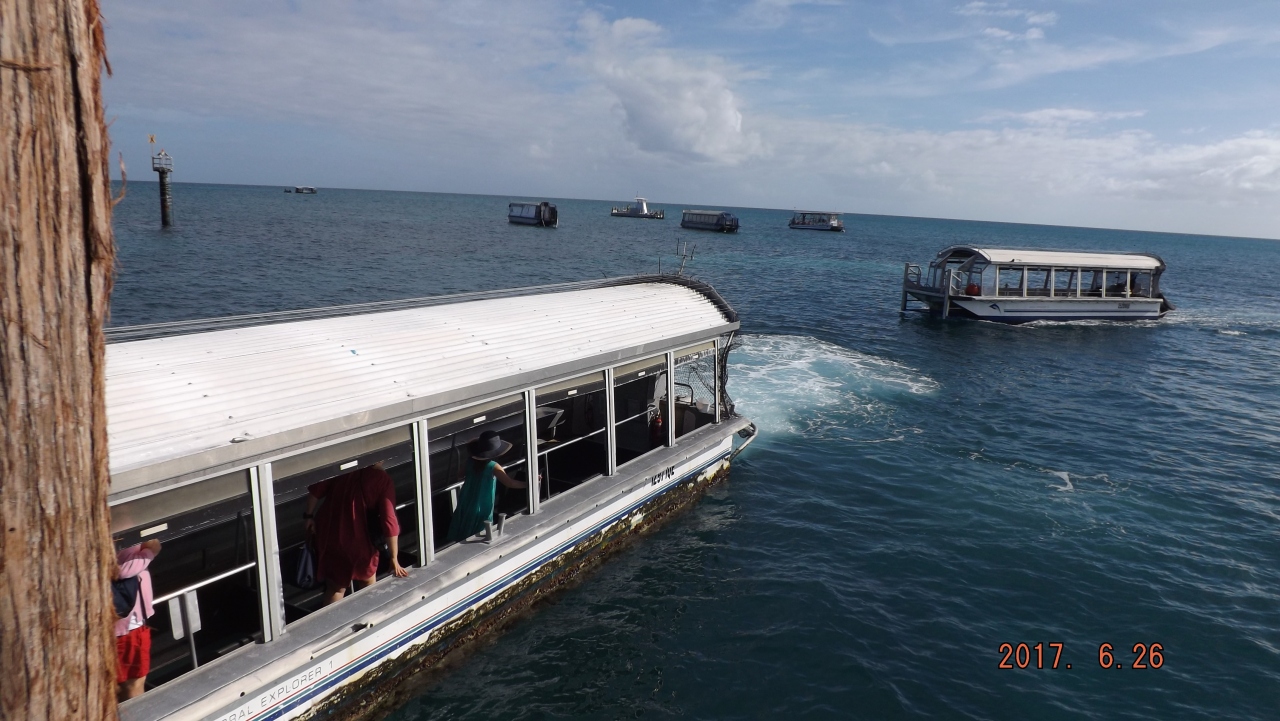 今日のツアには、シュノーケルもしくはグラスボトムボートでの珊瑚鑑賞が選べるようになっています。グラスボトムボートは、船底がガラスになっており、海底のサンゴ礁や海中を泳ぐ鯛やアジに似た魚やカニを見ることができました。