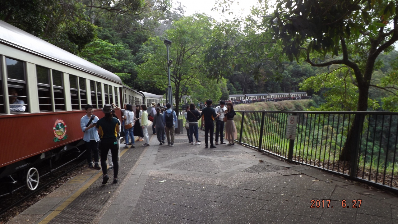 キュランダからケアンズまで1時間55分の乗車ですが、今日の停車駅はこことケアンズの1つ手前のフレッシュウォーター駅の2つだけでした。10分ほどすると1回目の汽笛が鳴り、乗車の合図です。2度目の汽笛で出発です。非常にゆっくりと走ります。