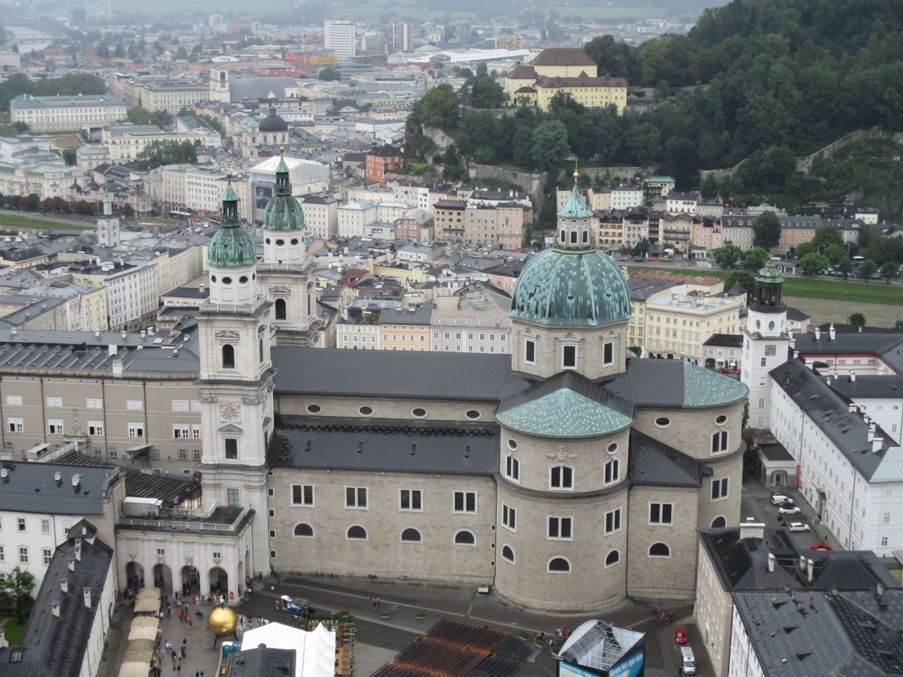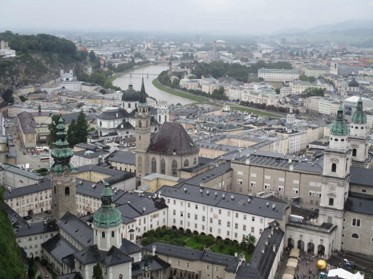 山の上にそびえるザルツブルクのシンボル、11世紀に大司教ゲープハルトが築き上げ、17世紀まで増改築が続けられたそうです。ケーブルカーも城塞もザルツブルクカードで無料になります。城塞から観る新旧市街の眺めはとても素晴らしかったのですが、残念ながら風雨が強くなりゆっくり楽しむことができませんでした。博物館には豪華な部屋や備品の展示がありましたが、一番上のフロアはザルツブルクカードを持っていても別に入場券を購入しなければなりませんでした。