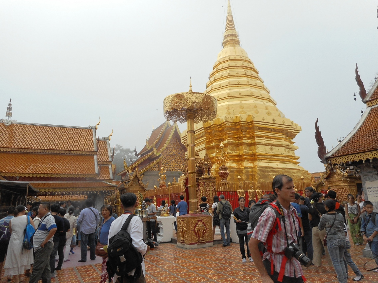 チェンマイの郊外寺院では最大の寺院です。自力で行くことも可能ですが、ツアーを頼んでいきました。目的の寺院は山頂にあります。山頂まではケーブルカーがありますが、私は歩いて登りました。5分ほど頑張れば山頂の寺院に行けますよ。山頂では黄金の仏塔が目にきらびやかです。麓には売店もあります。値段はすべて観光客価格で非常に高いです。