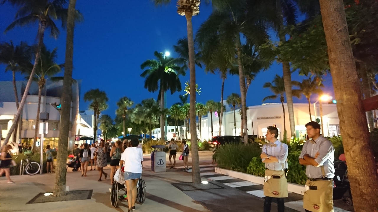 お土産屋さんもレストランも沢山並んでいる、ショッピング街です。特にレストランは道路にテラス席を設けている店がほとんどで、夜は歩くのも大変です。でも、雰囲気抜群で、マイアミに来た実感を感じる事ができます。