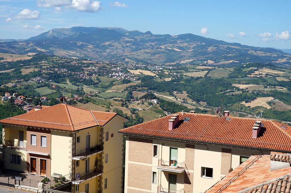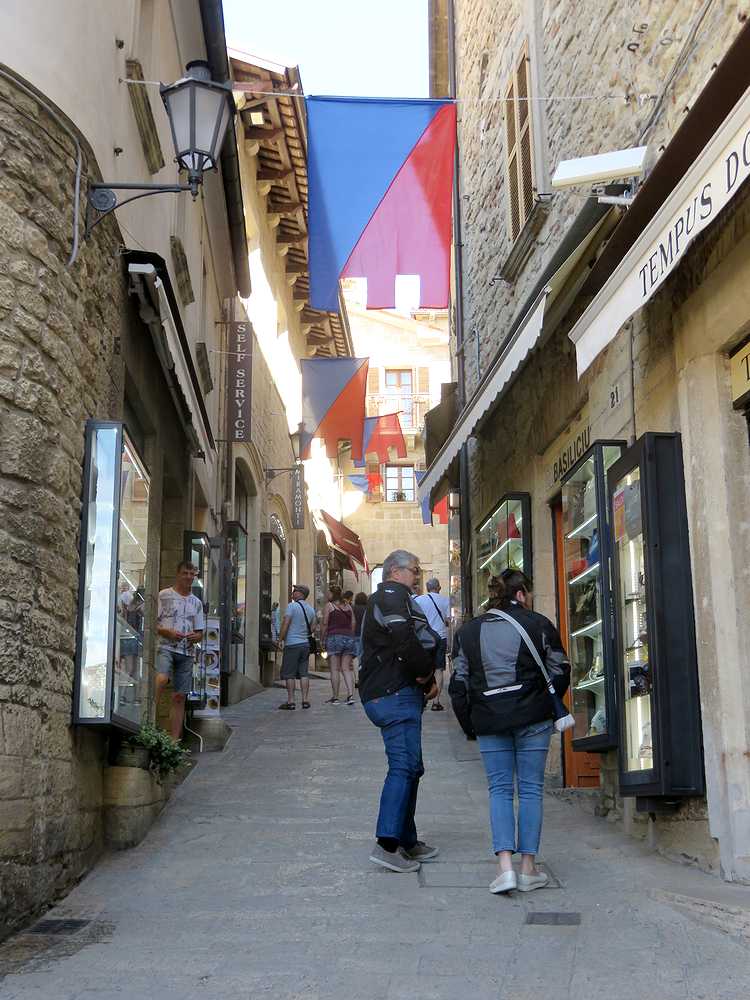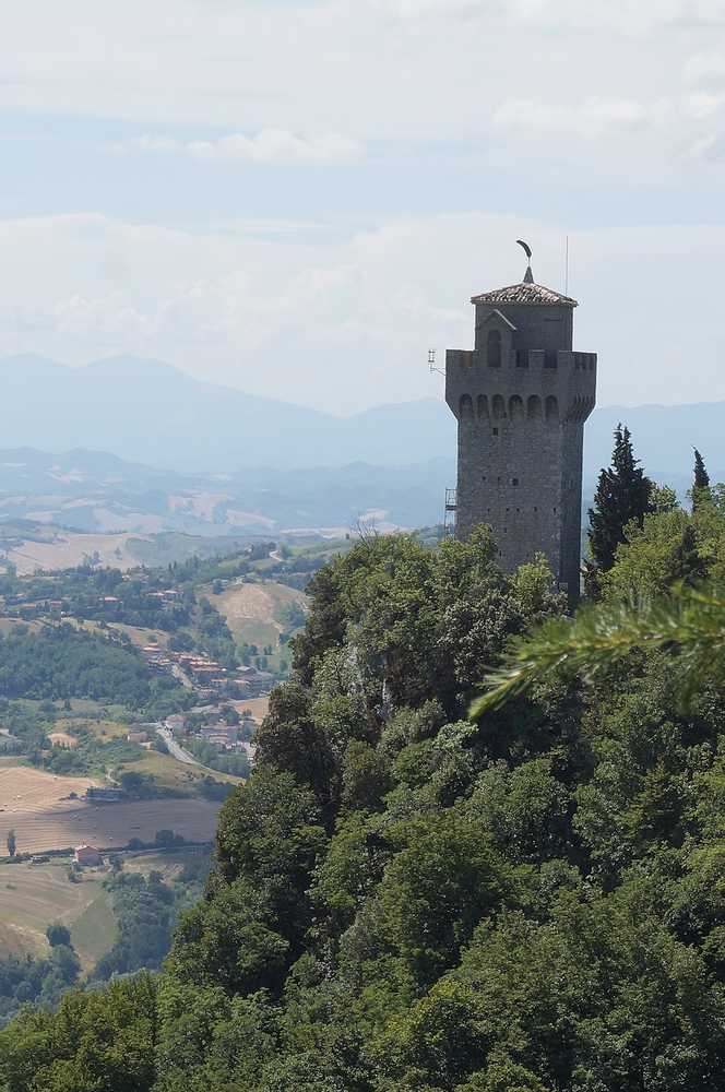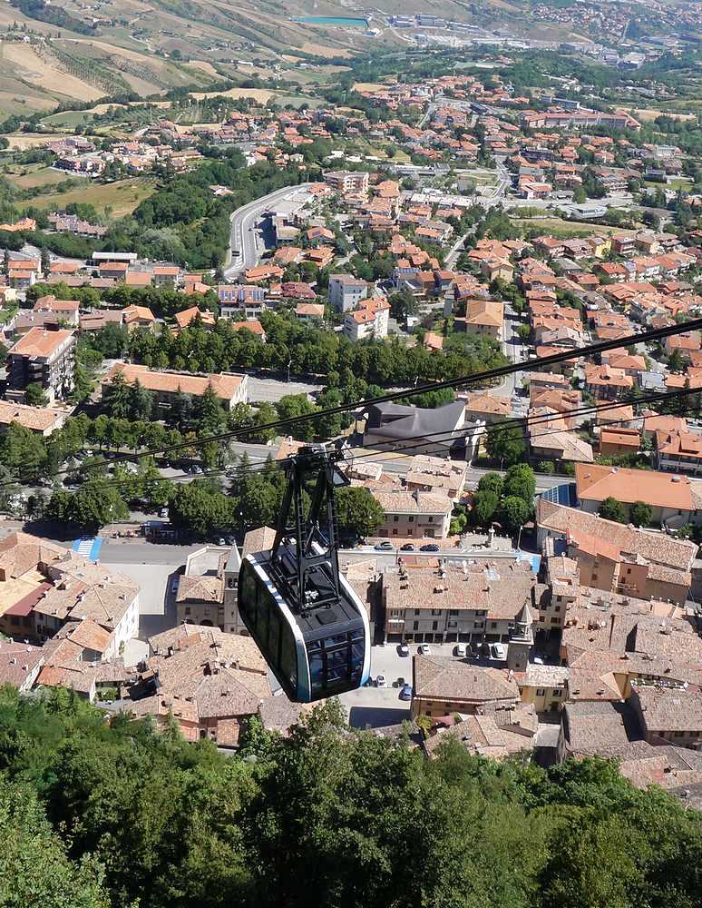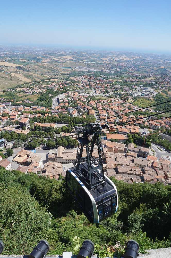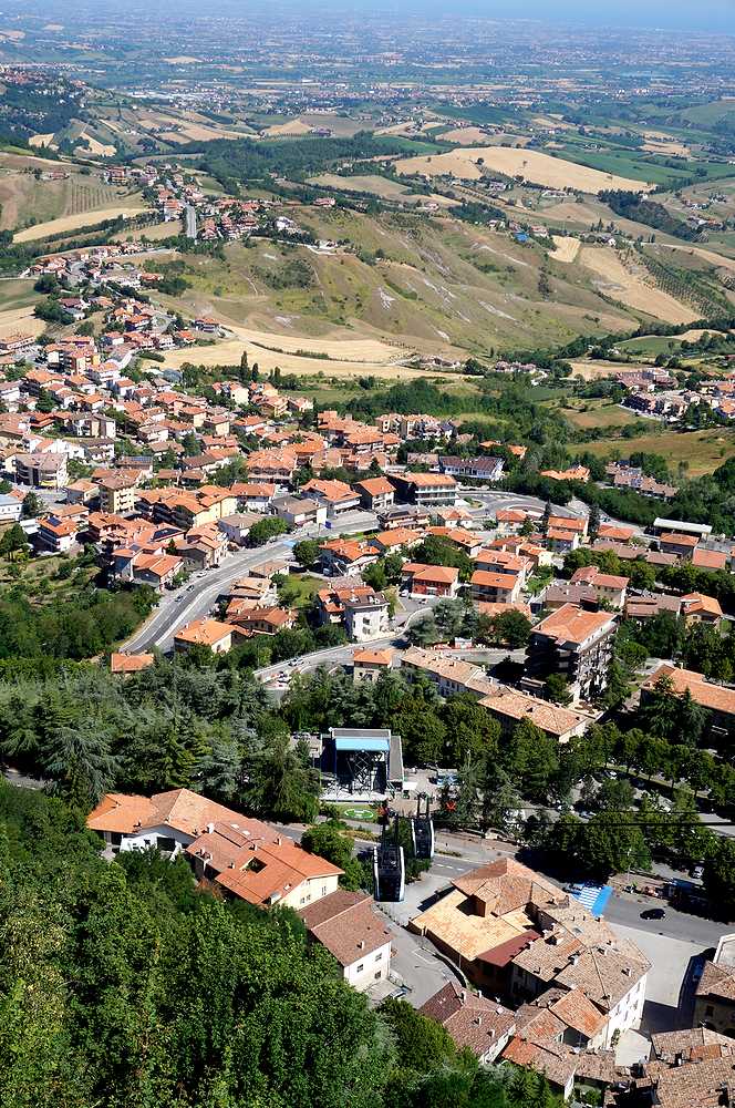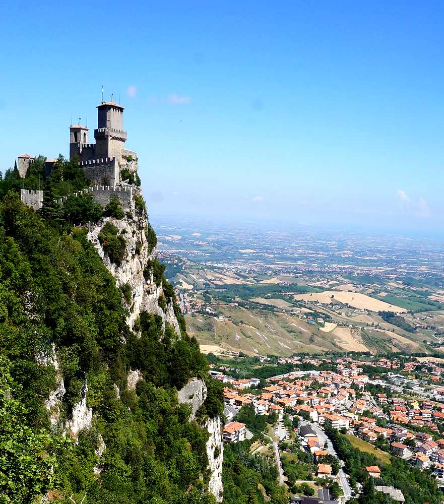 サンマリノ(San Marino)は。世界で5番目に小さなミニ国家で、現存する最古の共和制国家です。サンマリノ市やボルゴ・マッジョーレやセラヴァッレなどの町からなりたっており、中でもサンマリノ市は標高748mのティターノ山の上にあります。サンマリノ国内には鉄道駅はなく、イタリア半島の東海岸の町リミニからバスで行くのが、一般的な行き方です。また、山の麓からはロープウェイも通じています。私達はサンマリノ市へはリミニ駅前のホテルに一泊して、翌朝9時25分発のバスで日帰り観光しました。快晴に恵まれ、要塞からは素晴らしい景色を堪能できました。ケーブルカーには乗らずバスで終点の駐車場まで行き、石畳の坂道を登り、ケーブルカーの山頂駅を皮切りに、3つの塔(ロッカ・グアイタ、一番高いチェスタの塔(749m)、ロッカ・モンターレ(遠望だけ))を順繰りに見て行き、買い物やレストランには立ち寄らなかったので午前中で観光を終えました。サンマリノは消費税がかからないということで、やたらと時計や眼鏡などを売るお店が目に着きます。私達のような買い物に興味がないものには、景色を堪能したら、用がないので、早々にリミニに戻ってきてしまいました。山頂からの眺めは素晴らしいので、天気の良い日を狙って訪れることをお勧めします。なお、要塞巡りの途中では公衆トイレは見当たらなかったので、駐車場で済ませておくといいと思います。