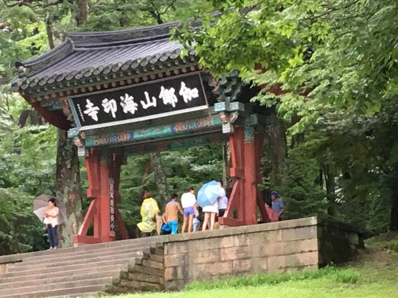 海印寺のバス停から 20分余り 山道の参道を 歩きます。とてもキレイ委に整備されていて 自然の中 森に囲まれ 小川の横をせせらぎを 聞きながら 進むと 海印寺の 入口? 木々の間にある 一柱門にきます。 その 対面には 世界遺産の印の石碑があります。(2017.8プサン20)