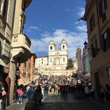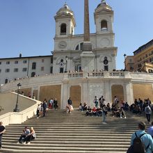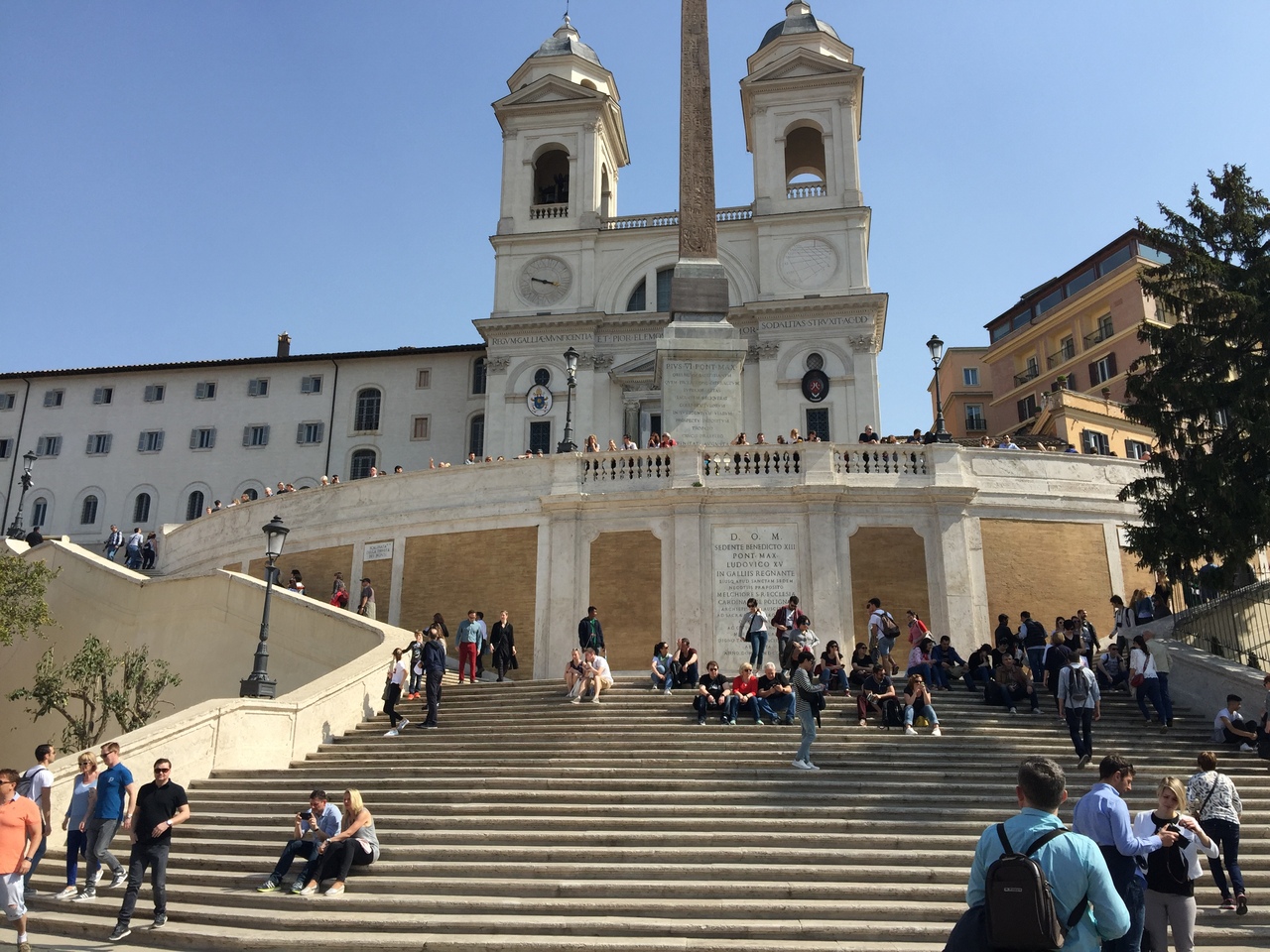 階段を登りきると、そこからはローマの街並みが見渡せる。観光に疲れたら階段に座り休むこともできる場所。3月でも日差しが強く暖かく感じた。時間帯によるが、スペイン広場の通りがふさがるぐらいの観光客で埋め尽くされ大混雑している。