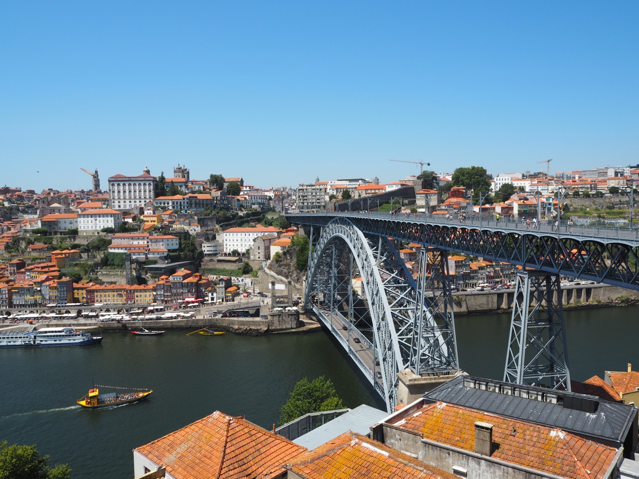 ポルトの町中を流れているドウロ川にかかる大きな橋です。下の段が自動車、上の段がトラム用になっていて歩行者はどちらも通過することができますが、上の段のほうが眺めがよいのでおすすめです。サン・ベント駅からまっすぐ橋へ向かうと上の段につながっていました。