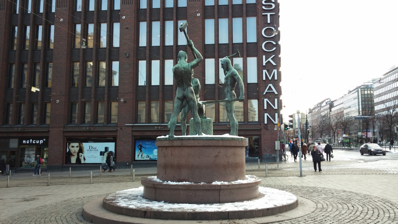 像は地元の主要モール、ストックマンの隣にあり、地元の人々に集まりのランドマークとも言われる。近くには多くのレストランと演劇の施設もあります。3人の男の像は裸で、約80年の歴史を持つ。何かを打つの様子です。