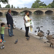水辺では鳥が遊び、ボート遊びをしている人も見えます。