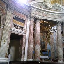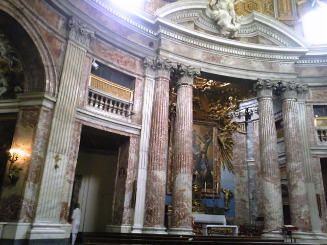 教会内部は色大理石がふんだんに使われていて美しい。クーポラの金色の装飾も素晴らしい。
