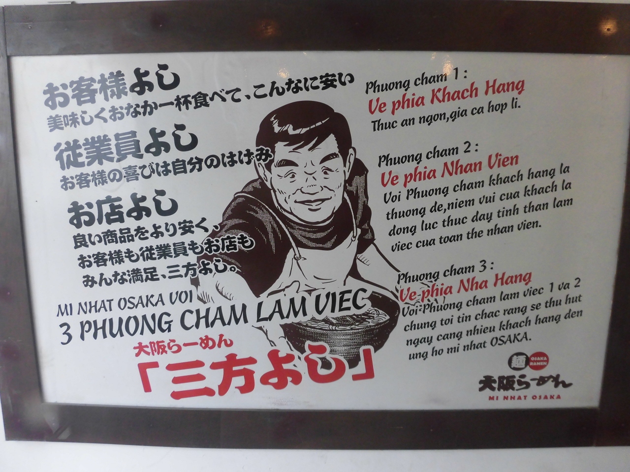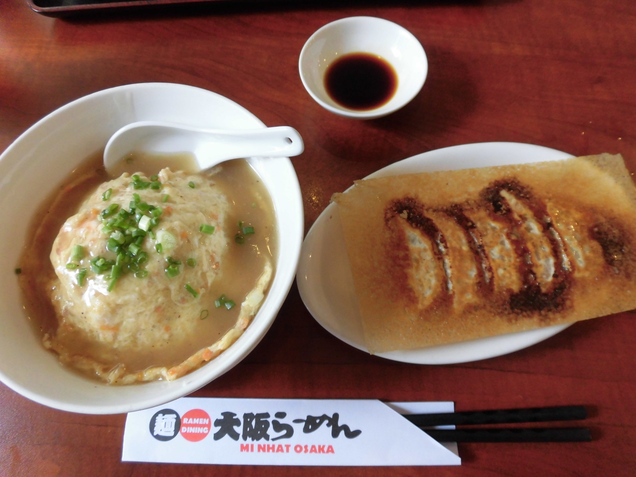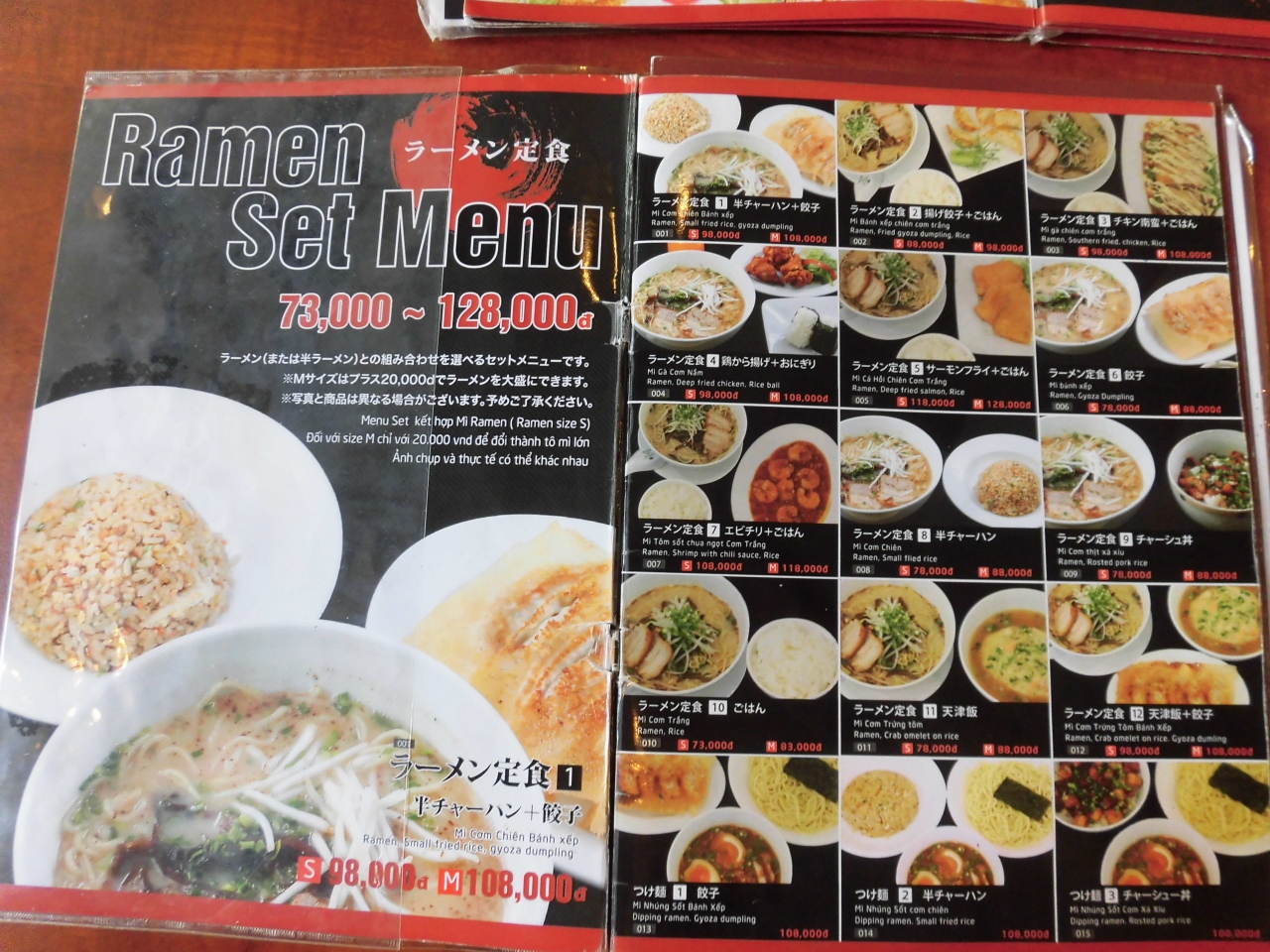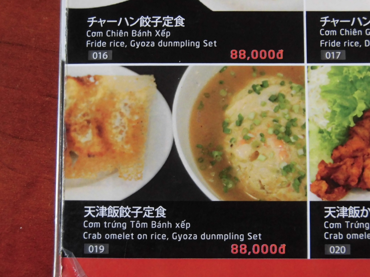 店の名前は大阪ラーメンですが、メニューは中華に近いです。天津飯餃子定食が88000ドン(約440円)でした。日本で食べるのと同じ味で、餃子は特に美味しかったです。物価の安いベトナムでも、エアコン付きのレストランで夕食を500円以下で食べられる店は多くありませんので、日本?の味を食べたくなられた特にはお勧めです。メニューのラーメンのページも掲載しておきます。