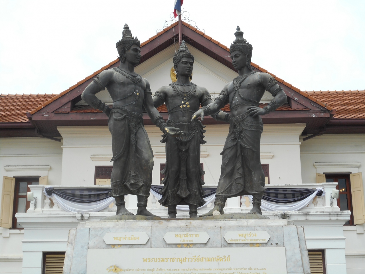 チェンマイ王朝に伝わる故事に基づいた像です。故事の内容は、チェンマイ周辺の3人の王様が「力を合わせて外敵と戦おう」という誓いを立てたというものです。現地ガイドに聞いたところ、タイでは誰でも知っている故事だそうです。像のある広場は芸術文化センターの中庭です。像以外には何もありません。観光客が像の前で記念撮影をしています。