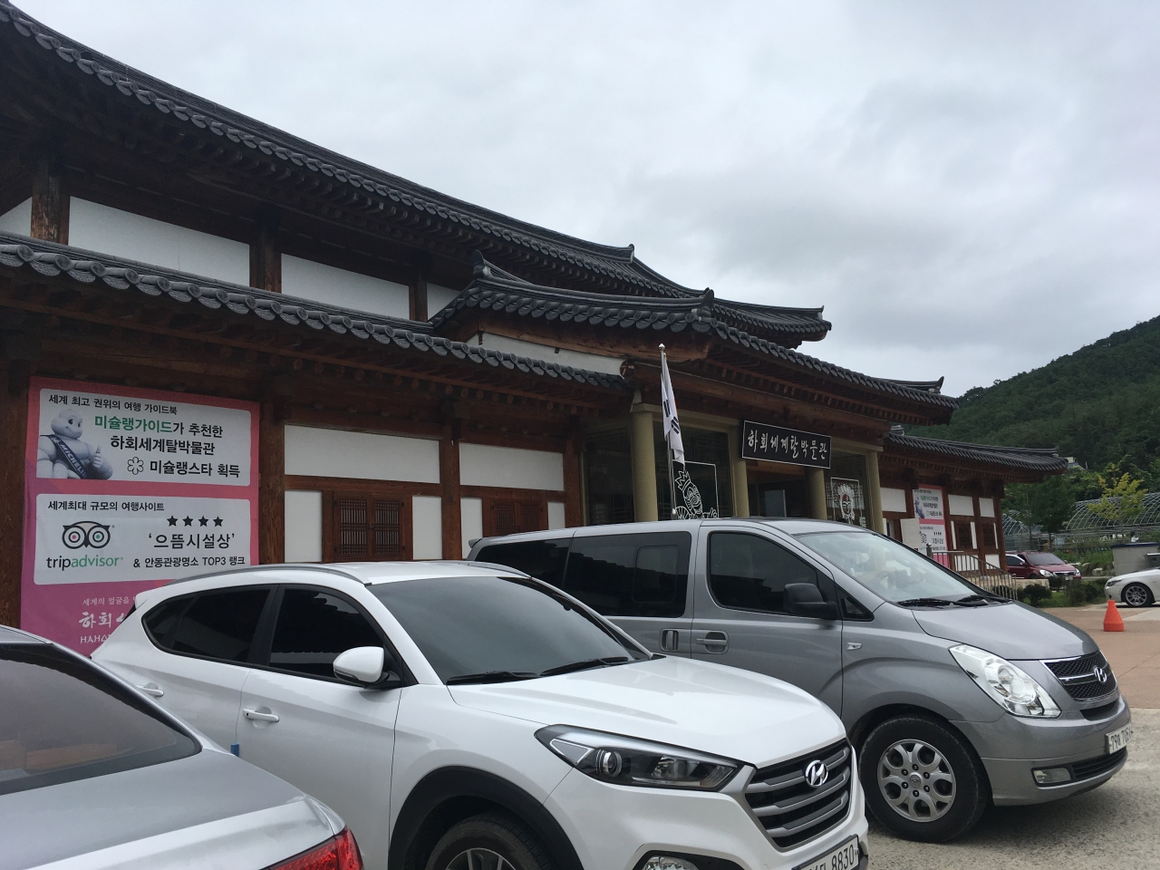 河回市場を過ぎて 河回村行きの シャトルバスの乗り場の 近くにある 世界仮面博物館。 安東別神グッタルノリに使われる 仮面のレフィルや グッタルノリの 登場人物の なり姿の人形を はじめ 世界中の 仮面が 展示されています。 日本の能の仮面も置いてありました。(2017.8プサン31)