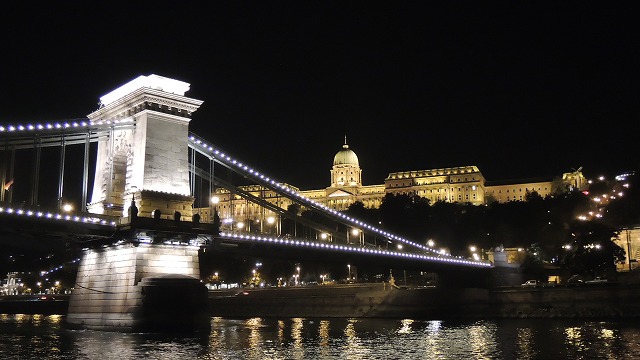 夜のクルーズ船から見るくさり橋と王宮は幻想的な美しさです