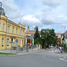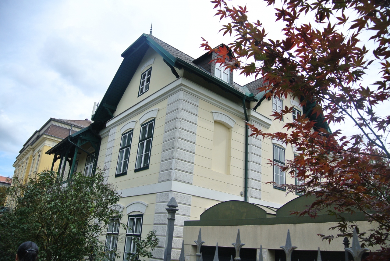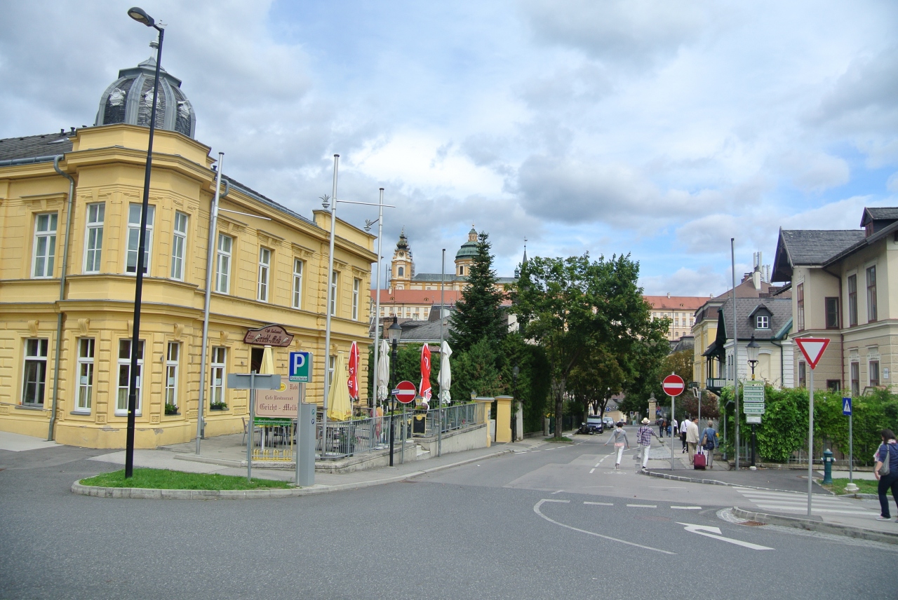 メルク駅から修道院の方角へ向かう通りで、正面には修道院が見えています。短い通りですが、駅からはなだらかな下り坂になっていました。両側には立派な邸宅が並んでいて、ガイドさんによれば、昔のお金持ちの邸宅だそうです。