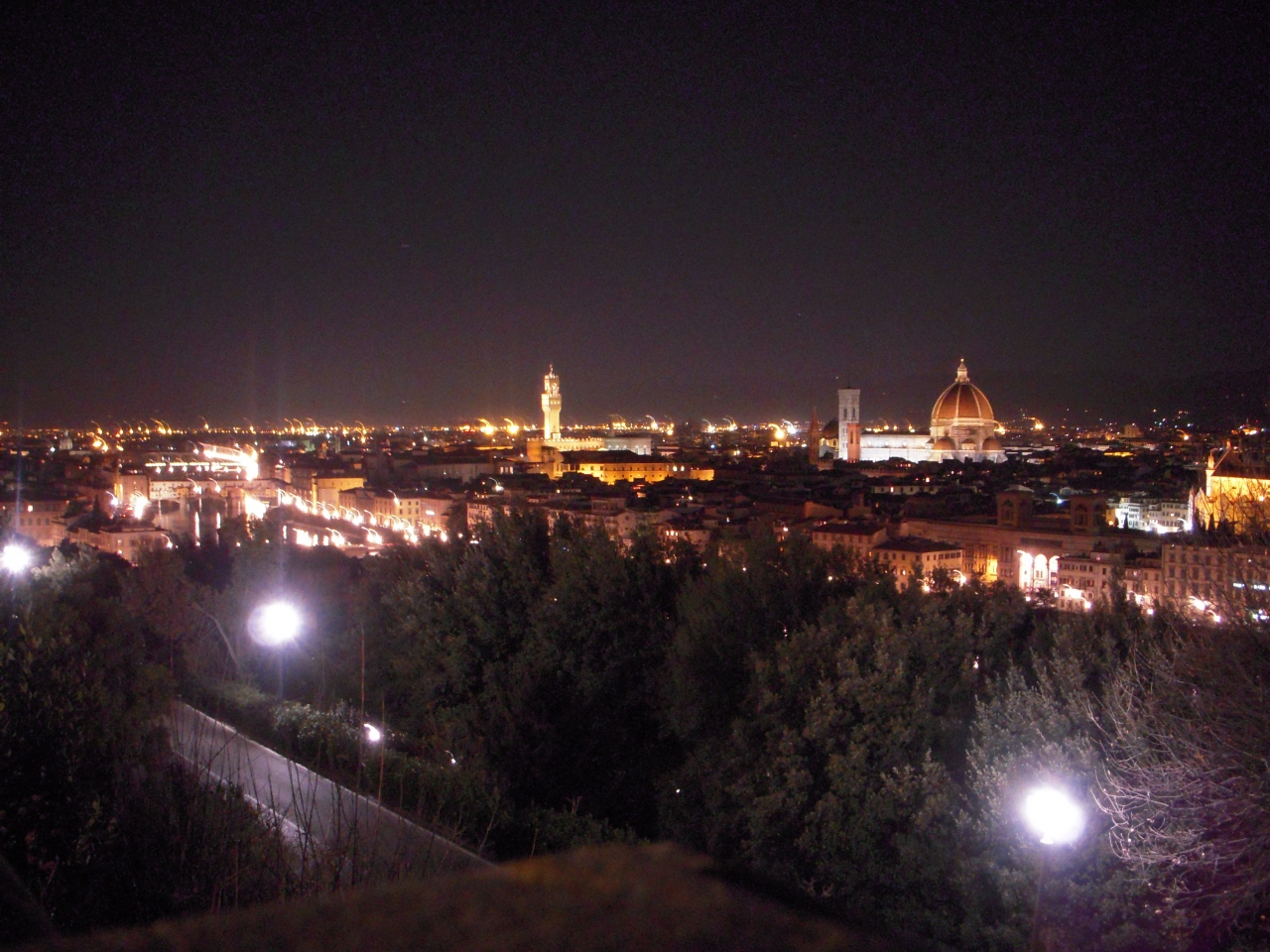 眼下にアルノ川が延び、目の前にはドゥオーモのクーポラ、左にはベッキオ橋がはっきりと見え、夜は建物や橋がライトアップされるのでそれは美しいです。