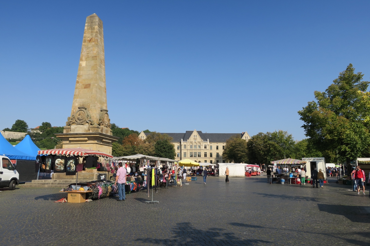 ドイツの街中の広場にはよくあるように、ここもクリスマス前にはクリスマスマーケットがひらかれるそうです。クリスマスの時期でなくてもいろいろなお店が出ていて、特にきれいな花などが売られているのが目立ちました。