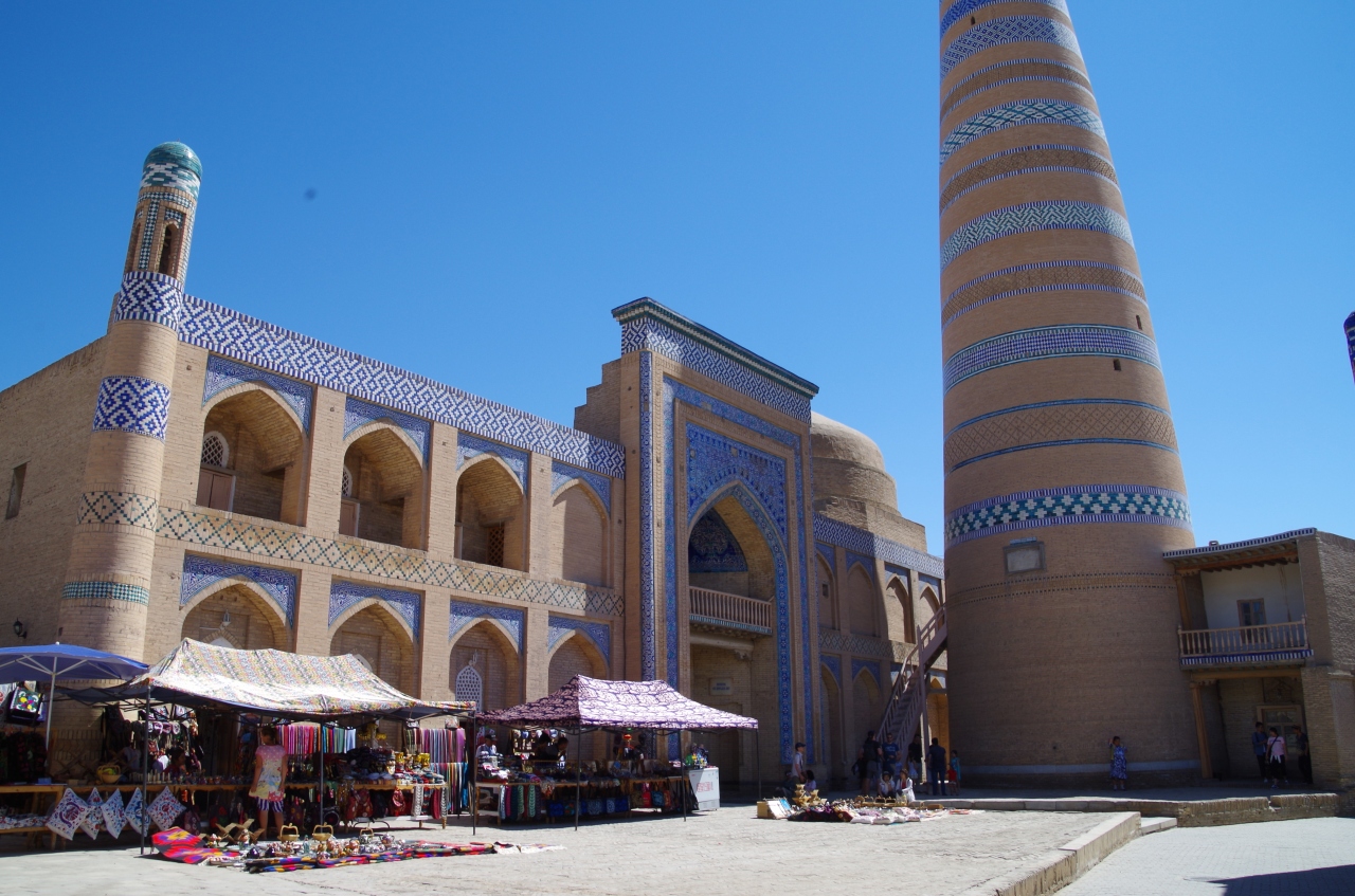 ヒヴァで一番高いミナレットが隣に位置しています。ミナレットは有料で登ることができます。メドレセの中は、民族衣装、陶器、布、写真などが展示されています。周囲には、お土産屋さんが並んでいます。木製品や布製品等。