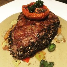ペッパーステーキをいただく、焼き方はミディアム。味は評判通り。