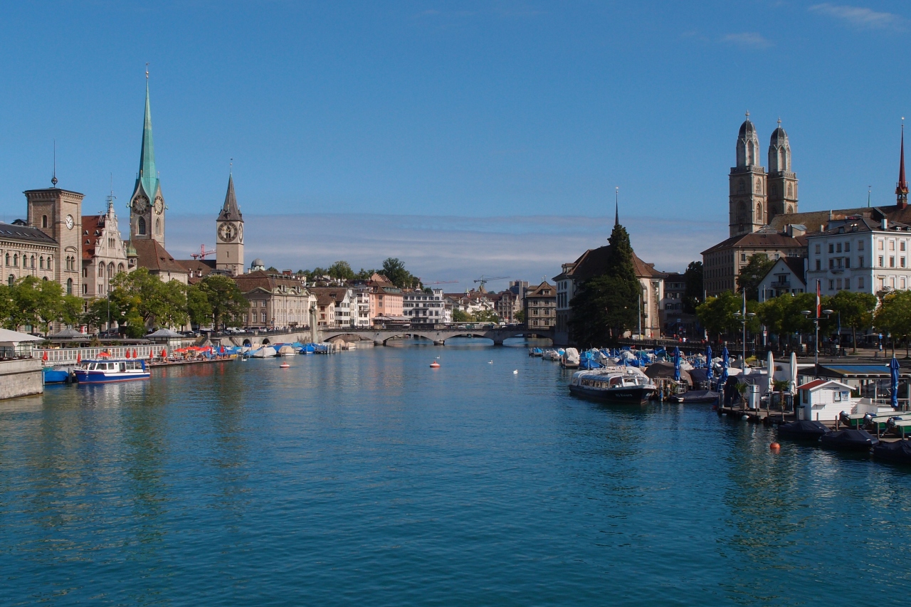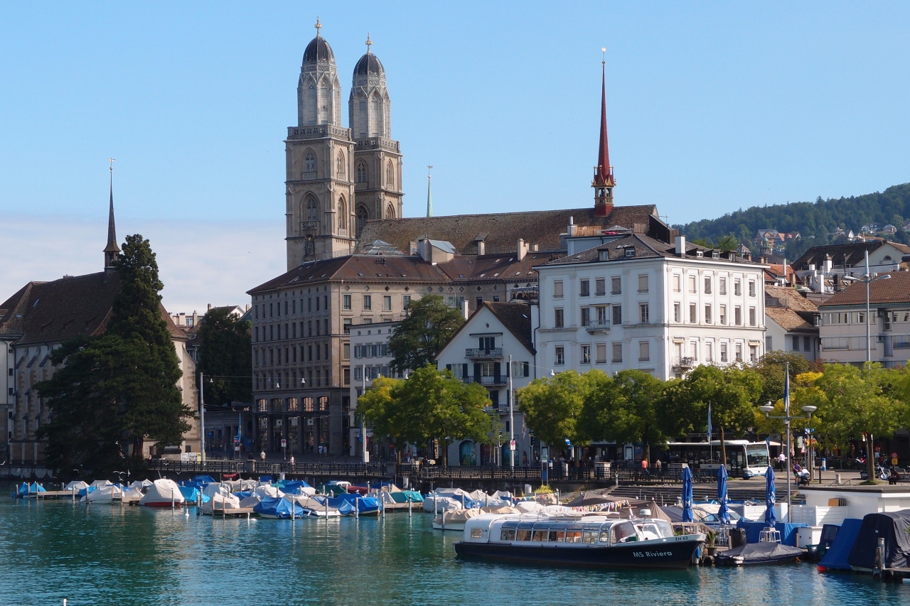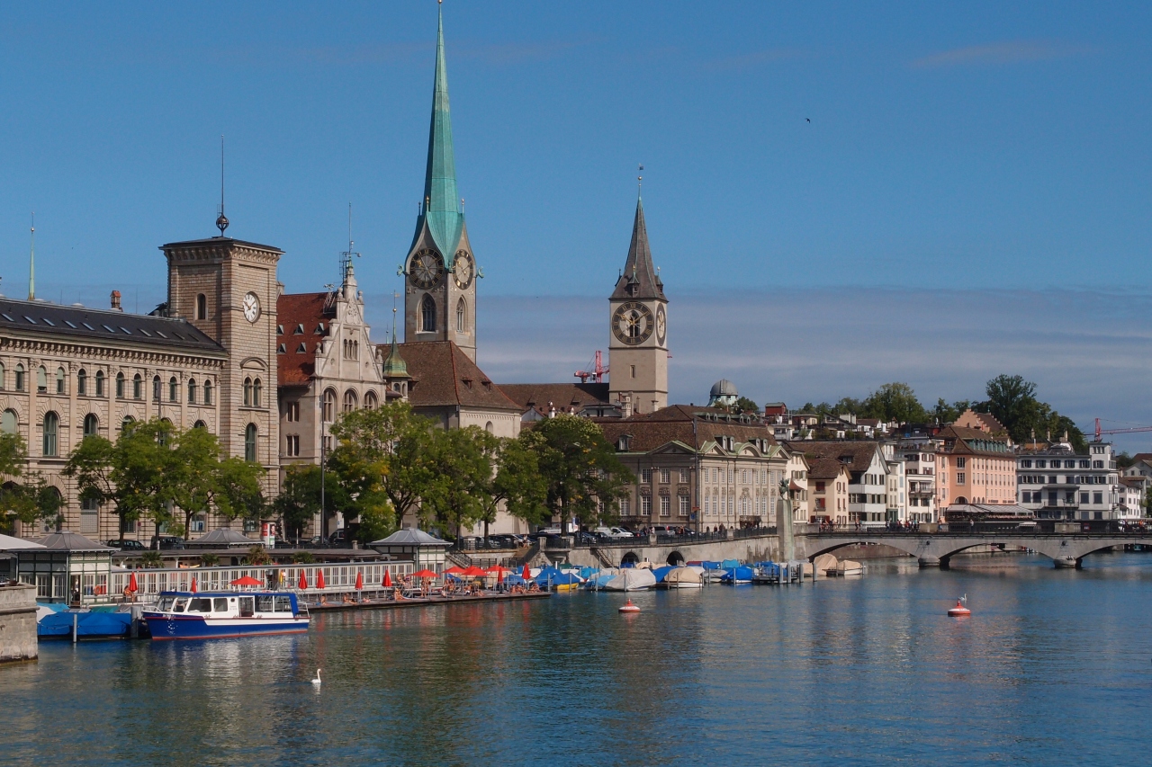 チューリヒ市街を南北に流れるリマト川には、たくさんの橋が架けられています。なかでもチューリヒ湖に一番近いケー橋からはチューリヒの美しい景観が楽しめました。左岸に聖母教会と聖ペーター教会、右岸に大聖堂がきれいに見えます。
