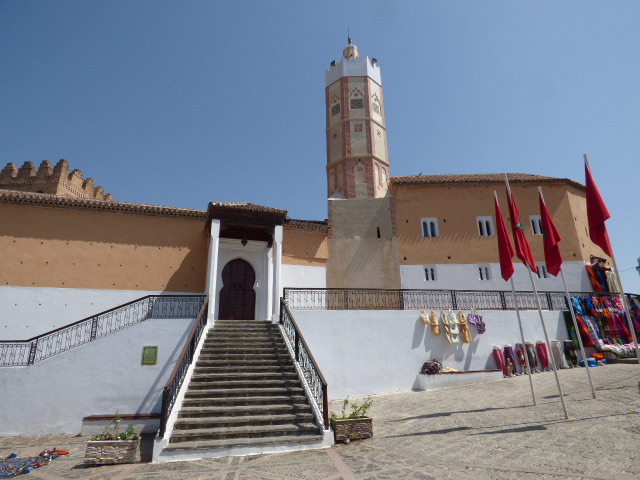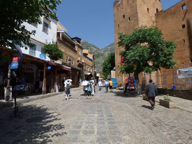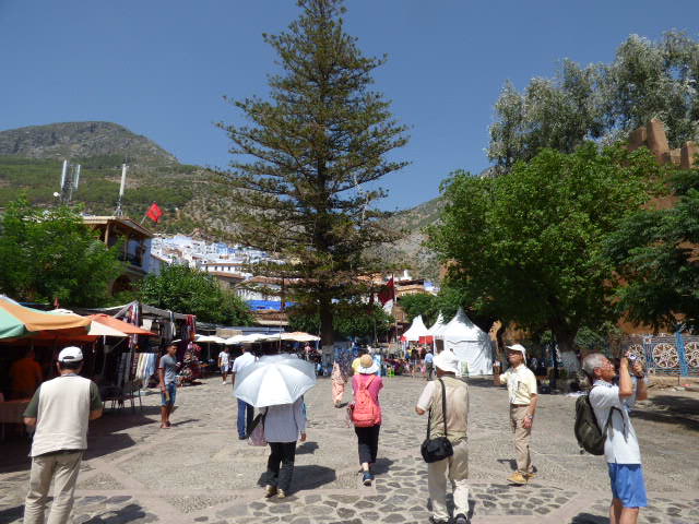 青い街、シャウエンを散策しましたが、中央にあるこの広場はゆったりしています。カフェでゆっくりできるし、土産店も数多い。市街の後ろに見える山も美しく、散策の休憩地点としていろいろな用途に対応できると思いました。自由行動の集合地点としても適しています。