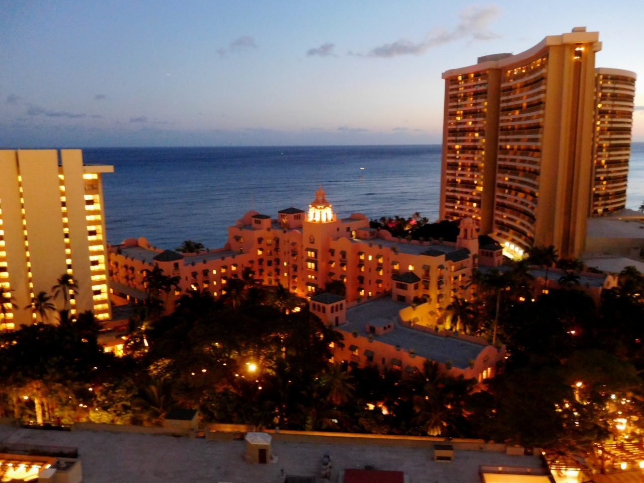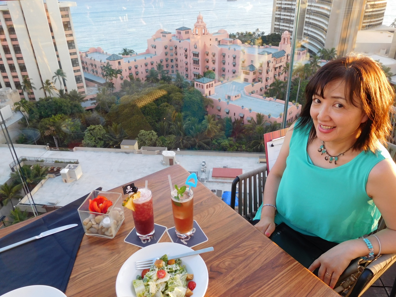 ワイキキビジネスプラザの最上階に新しくオープンした展望レストランである。古くからあったトップofワイキキは従来通りに営業しているが、その一段したの屋上フロアを拡張した所にテラス席を設置したもので、料理メニューを含めて、双方の運営は異なるものとなっている。この時の利用では、事前にコース料理を指定して予約したもので、ハッピーアワーの終了時刻からスムーズにテーブルに着き、ゆったりと食事を楽しんだ。サンセットタイムの空は美しいが、夕陽はオンザビーチの高層ホテルの陰に隠れてしまう時期だった。しかしながら、ピンクパレスを眼下に眺め、ワイキキの素晴らしいナイトビューを堪能しながらの食事は、とても満足できるものである。そういった環境の雰囲気を考えると、食事の料金設定はけっして高いものではないと思う。世界的にも食事物価の高いワイキキである。料理の味以外にも、お楽しみがある場所が楽しい。
