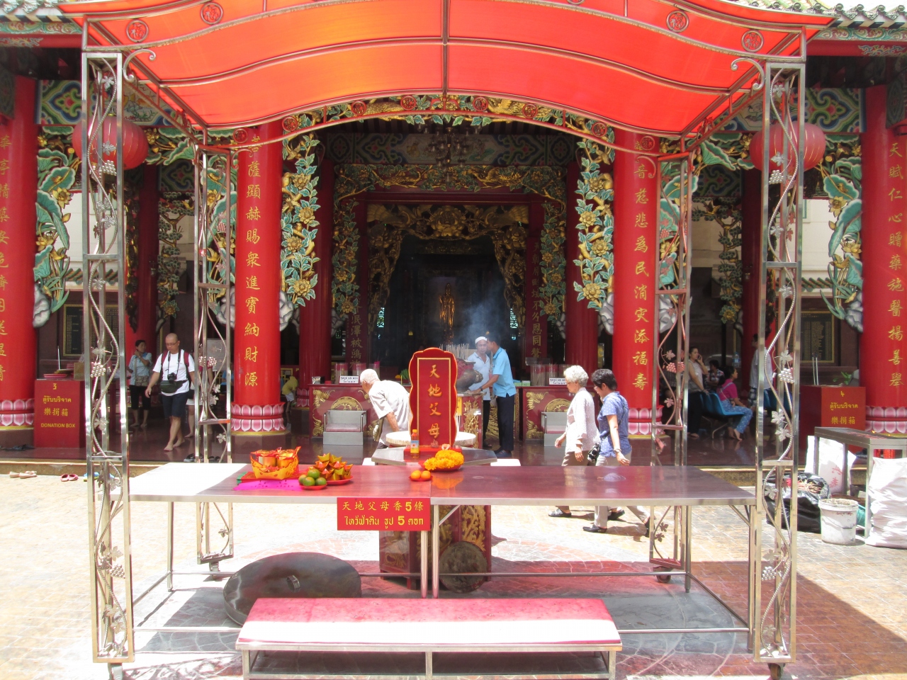 春節が近づくと、中華系タイ人に加え、中国人観光の参拝客で混雑します。本堂前の段差があるところから土足厳禁で、タイの寺院のスタイルと同様、靴を脱いで参拝する必要がありました。赤系の服やチャイナ服を着て参拝するのがスタイルのようでした。