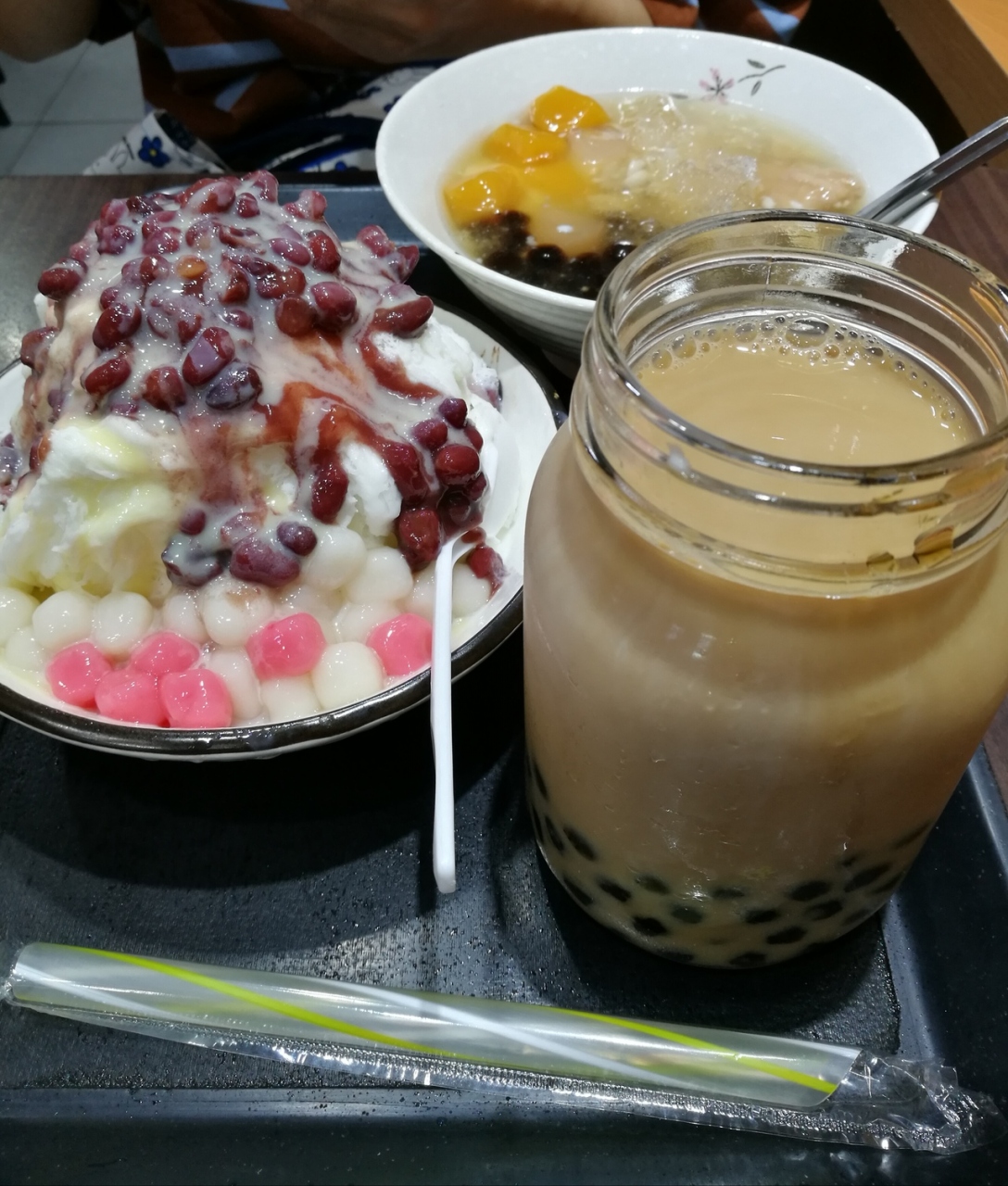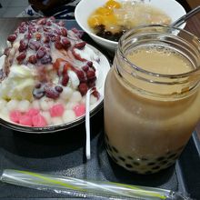 AからDまでのセットがあり、タピオカミルクティー、白玉入り練乳かき氷、豆花がセットになったDを選びました。このセットが大正解でした。タピオカ、白玉共にもちもちで美味しく、二人で食べてもお腹いっぱいになりました。一生分のタピオカを食べた感じです。ごちそうさまでした~。