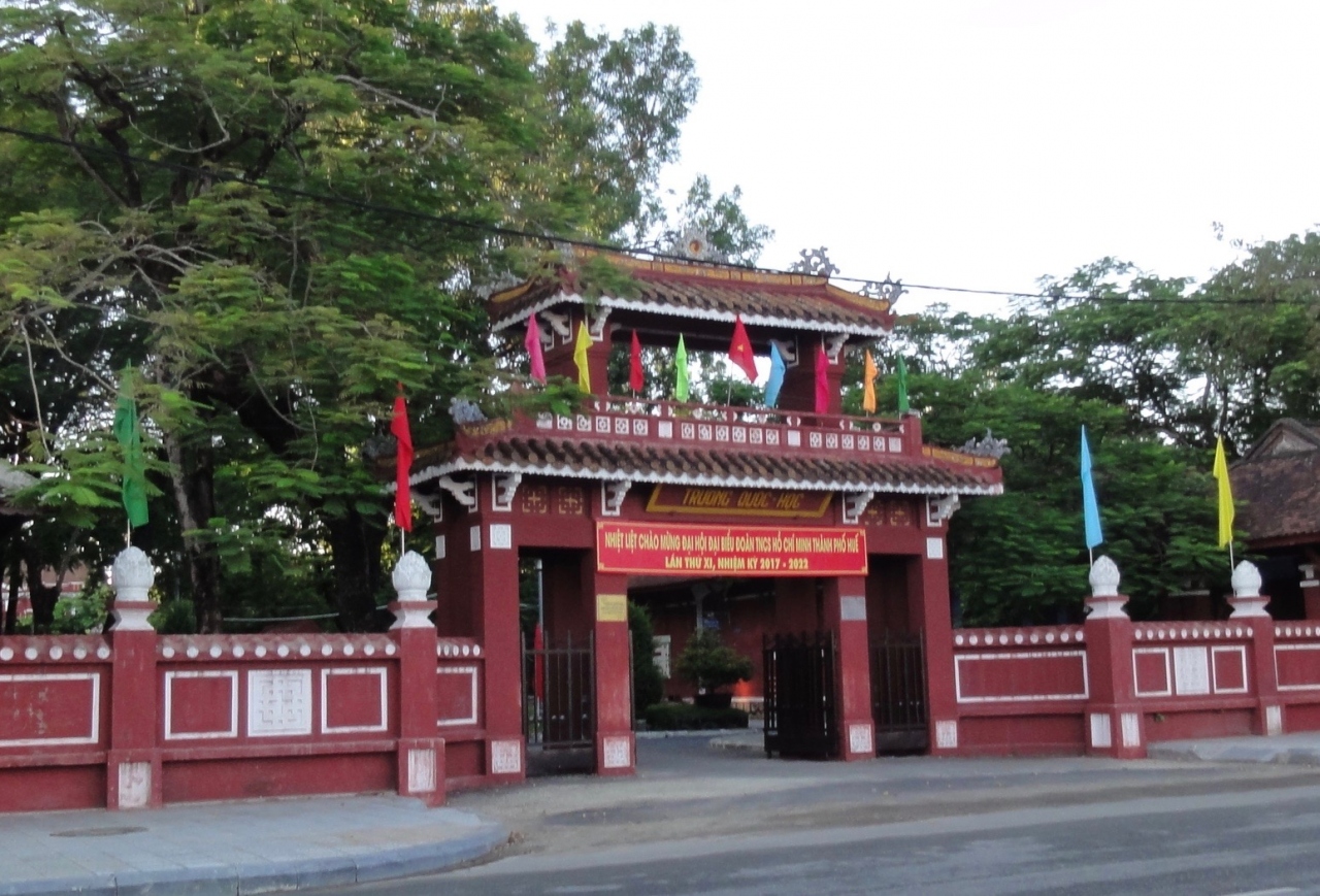 ホーチミンをはじめ、数々の著名人を輩出した由緒ある名門校で、かつては男子校だったが現在は共学の高校だそうです。中には入っていませんが、赤い門がとてもきれい。覗いたところ、中の建物も同じ赤が使われているようです。緑にはえてとてもきれいです。