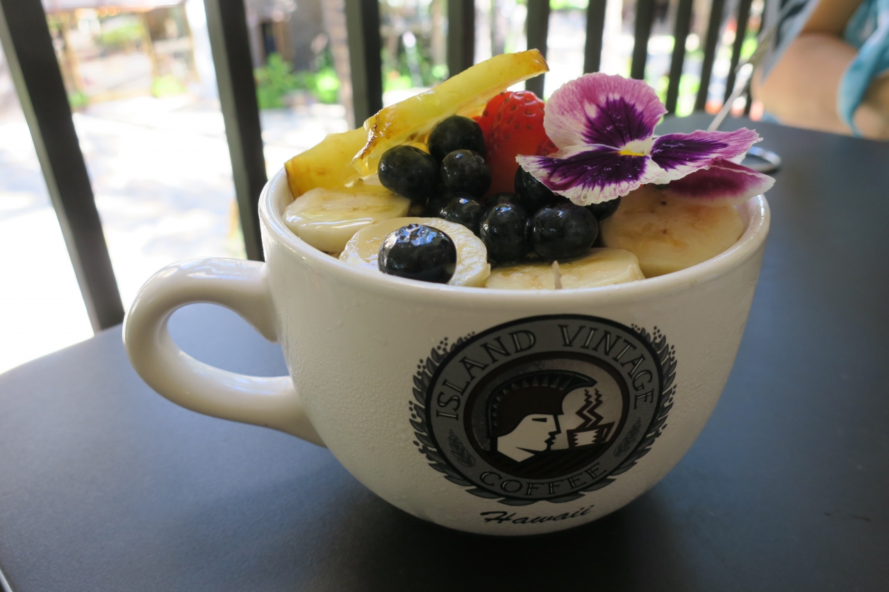 同じお店ですが、奥にあるのがオーガニックのアイランドビンテージコーヒーです。食べる場所は一緒なので、今回はオーガニックのアサイボールを注文。あっさりした甘さで、行列なく注文できたのがよかったです。お花がのっているのが◎