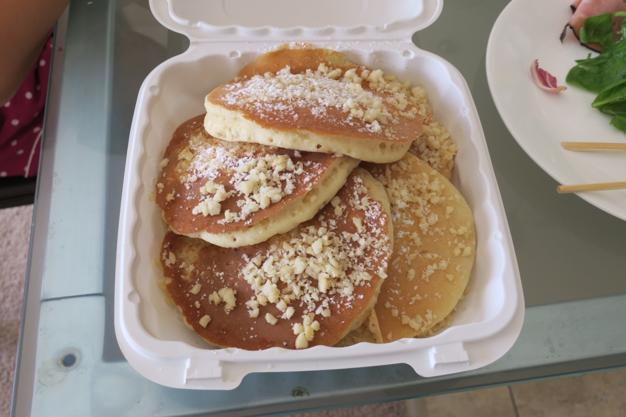 店内で食べるには行列ができていましたが、テイクアウトなのですぐに注文できて、待ち時間も少なくすみました。前回たべて美味しかったマカナッツパンケ-キはシロップが3種類ついていて、5枚もありボリュームがありました。