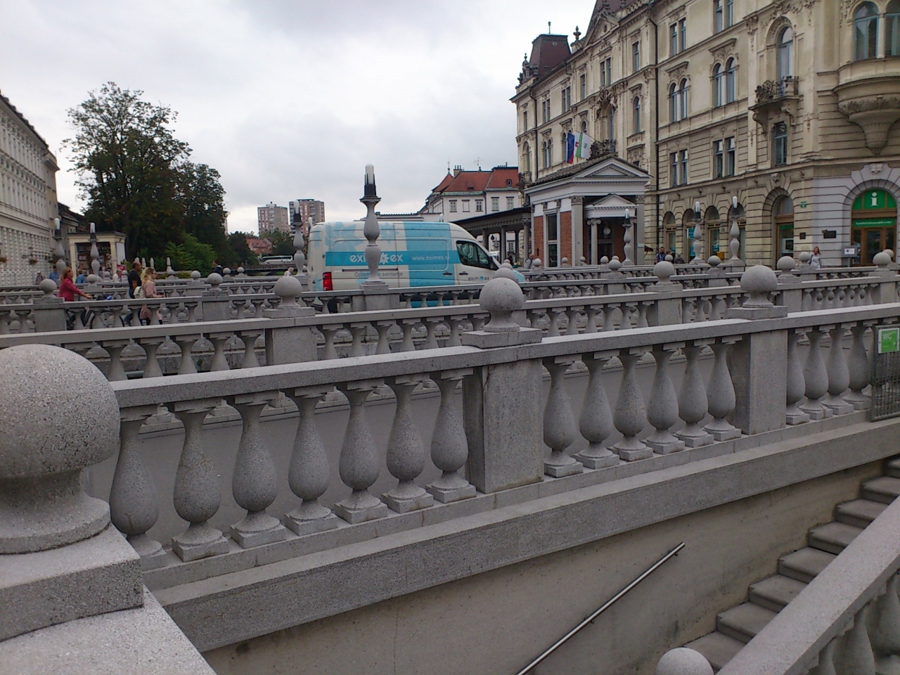 リャブリャナ観光の1番の目玉の場所です。と言っても、他の見所もこの近くに固まっているので、リャブリャナ観光は1時間も掛からないような小ささです。名前の通りに3つの橋が1箇所にかかっています。真ん中の橋だけが車が通行可能で、左右の小さな橋は歩行者専用です。白い色が周りの景色の映えます。