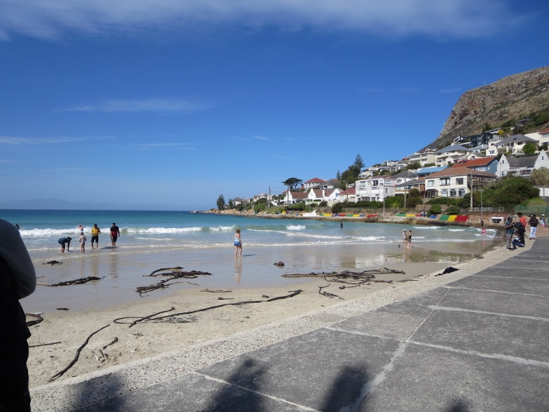 ケープポイントからの帰りにフォールスベイの中央部のフィッシュホークで昼食を取りました。海岸にあるレストランだったので、日曜の午後のビーチに家族連れがのんびりしているのが見えました。冬場ですが海水浴をしている人もいました。気温は26度くらいはあったと思いますが、海水は冷たく感じました。