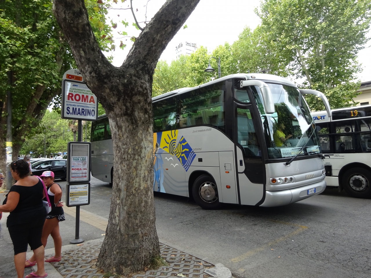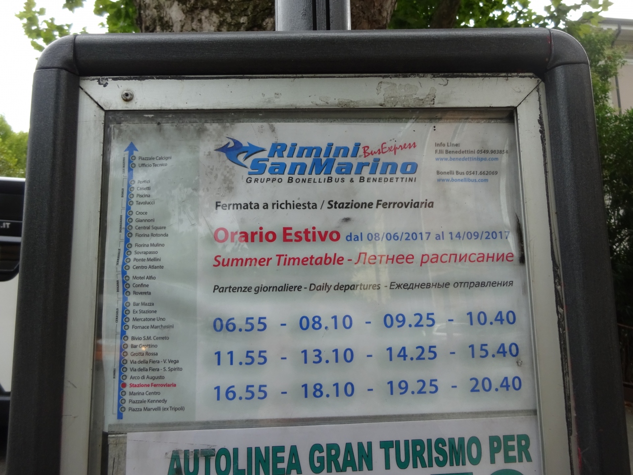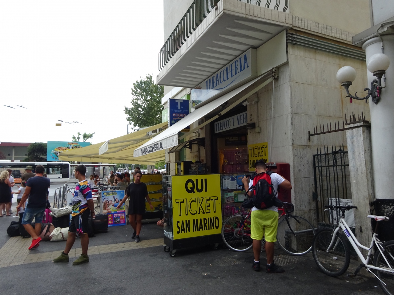 サンマリノ共和国へ行くには、リミニ駅から路線バスを利用します。シーズン中は1日12往復、片道5ユーロ、所要時間は50分です。バス停はリミニ駅を背にして右側、切符は近くの売店で往復分買えます。私は昼過ぎのサンマリノ行きに乗りましたが、立ち席の方もいて結構混みました。
