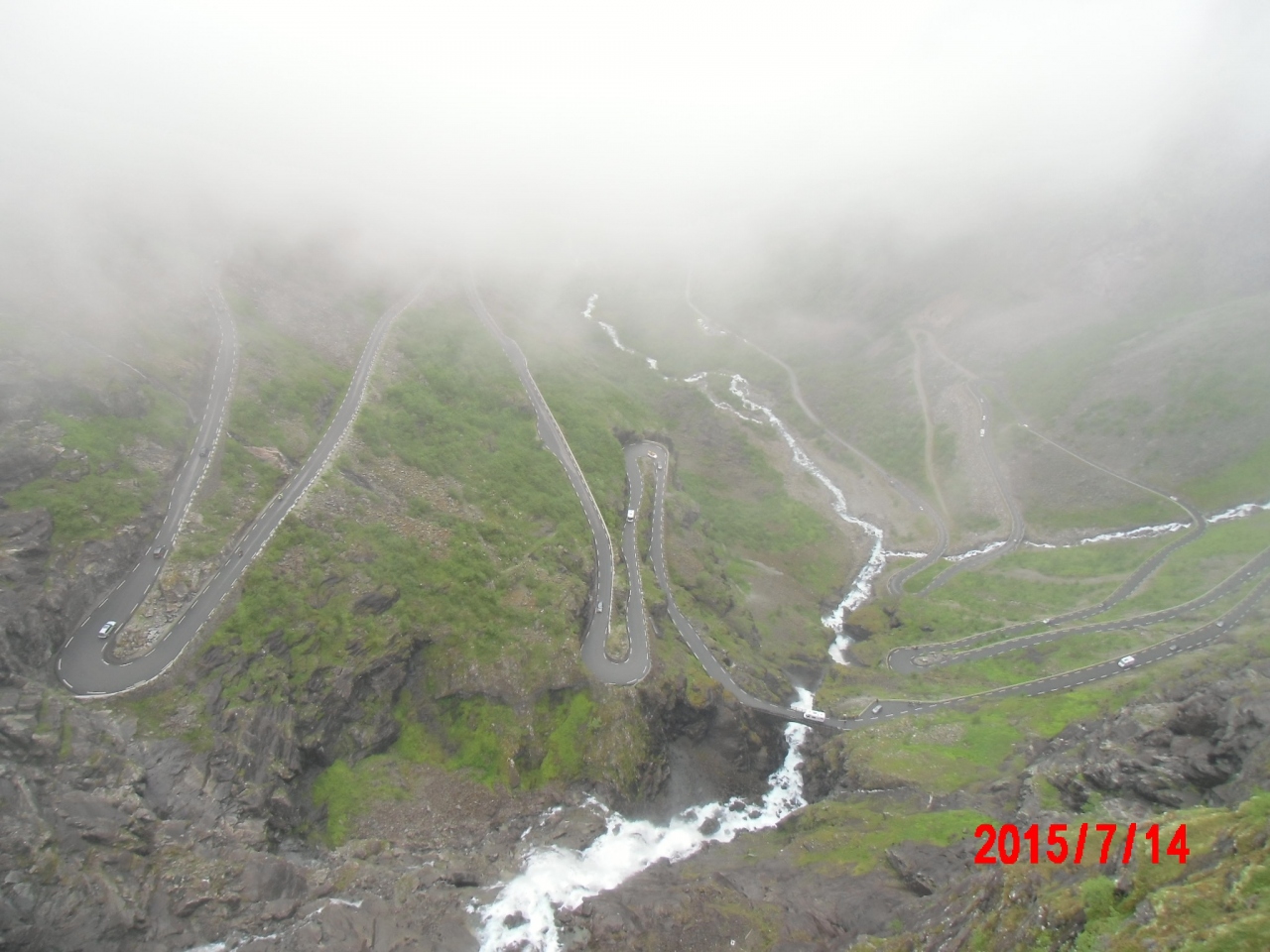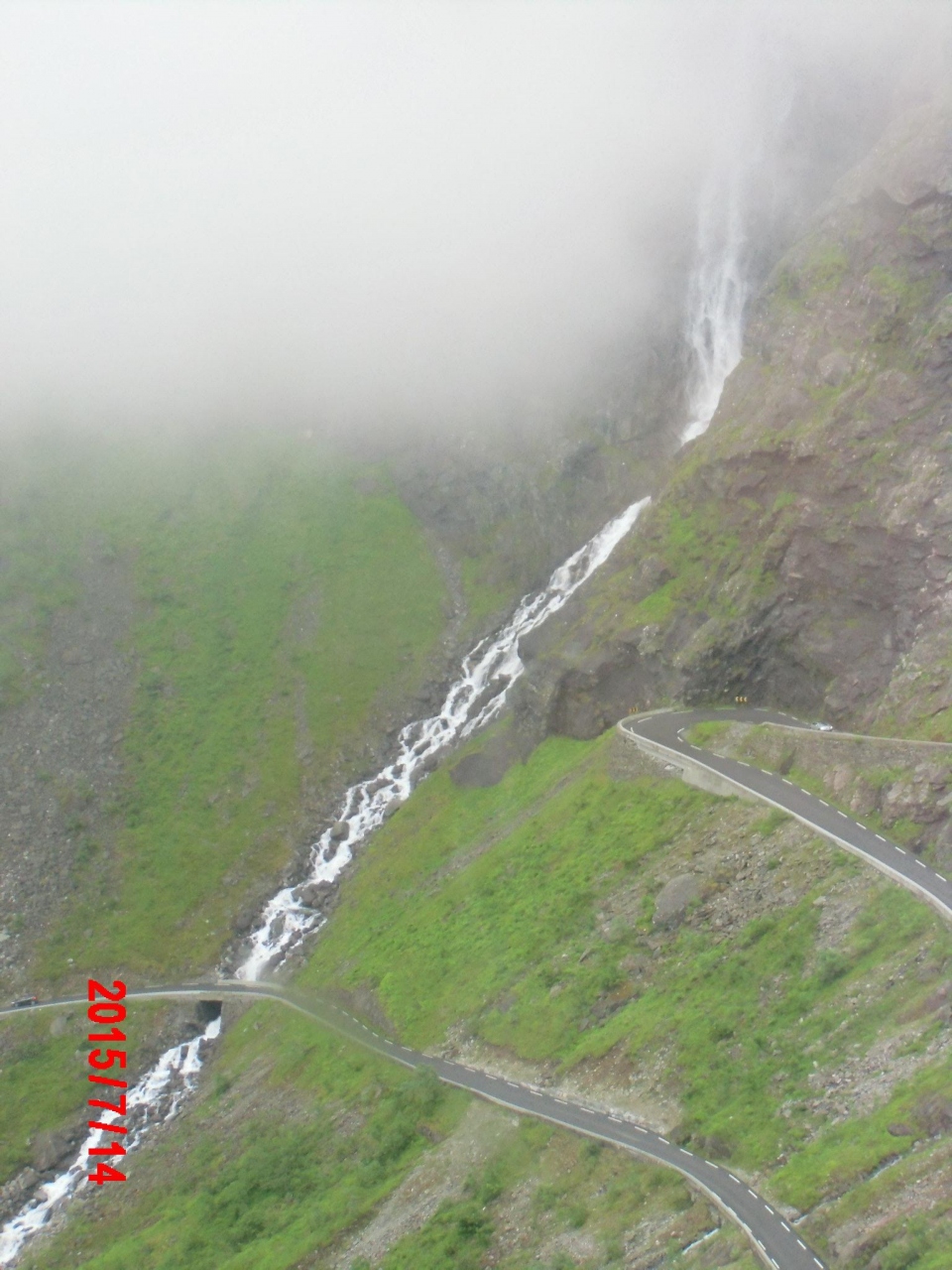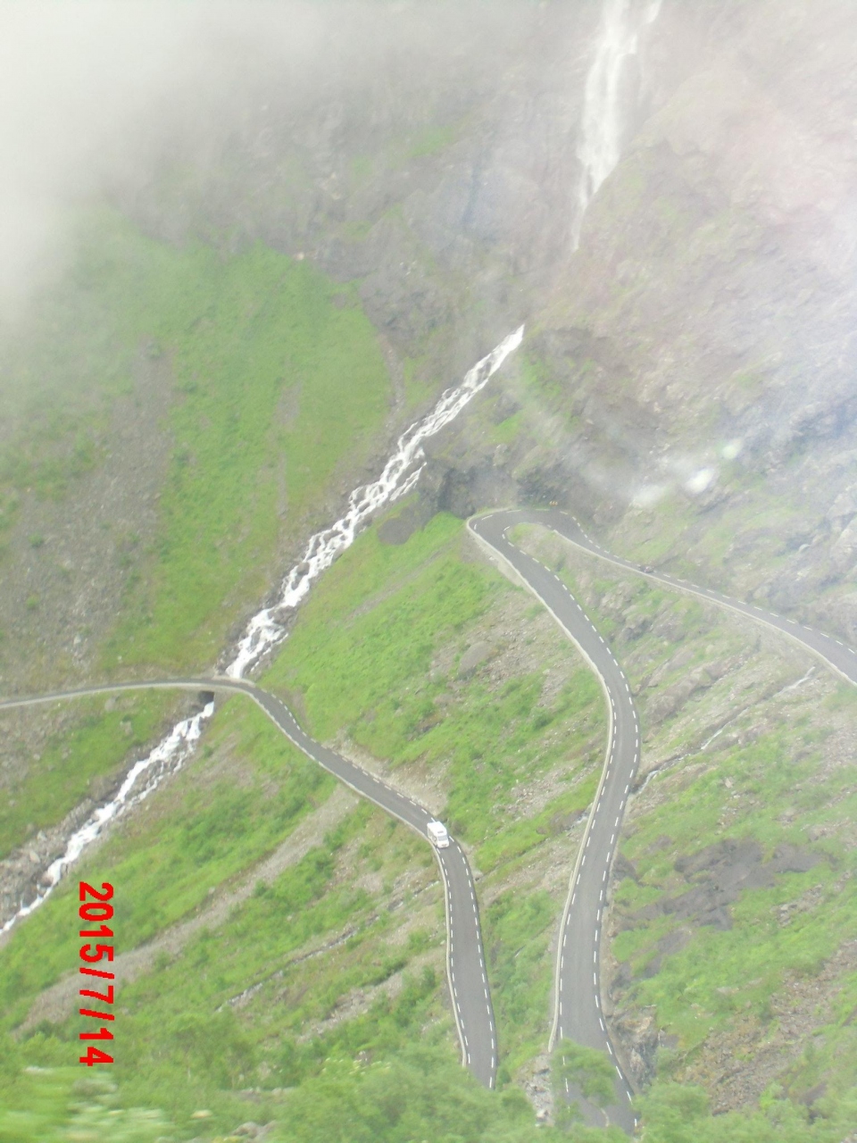 氷河が削り取った切り立った深い崖と人間が作ったいろは坂のような道路と滝の共演です。