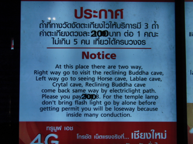 洞窟内に入るには、入口で入場料を支払い、途中で更に200バーツを支払うと、灯りがともされていない奥まった鍾乳洞内をガイドさんに案内いただけます。