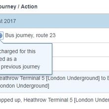 なお、今回の利用でオイスターの明細を確認したところ、チャージされるべきところがゼロになっていました。調べてみると、HOPPER FAREと呼ばれる乗り継ぎ割引制度で、「最初のバスでのオイスター・タッチから、1時間以内に乗り継いだバスでタッチをした場合、後のバスは無料」というもので、2016/9に導入されたようです。