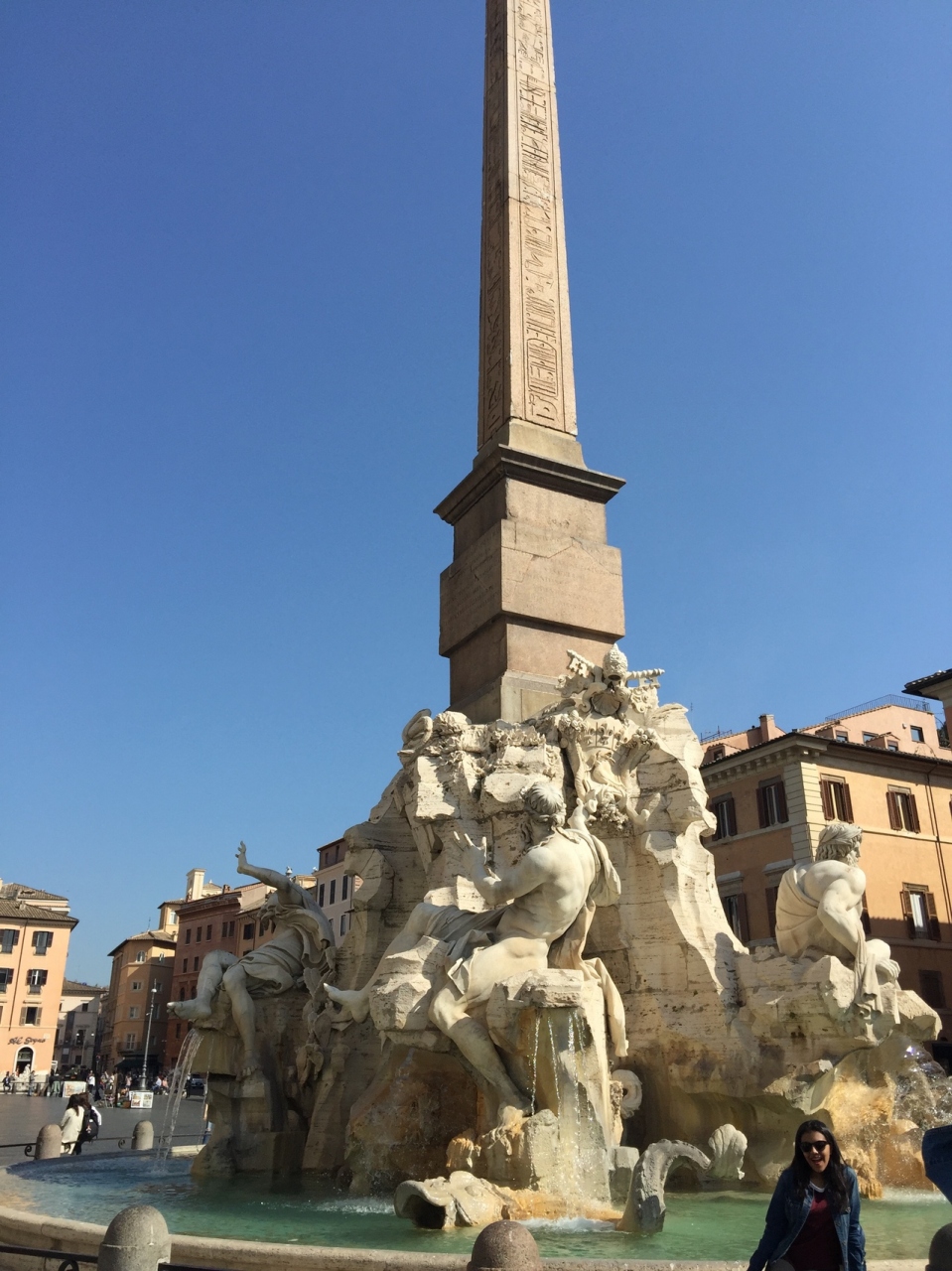 ナヴォーナ広場の中央にある存在感たっぷりの噴水。ベルリーニ作のこの噴水には4人の男性が登場し、それぞれ世界の4つの大河(ナイル河、ガンジス河、ドナウ河、ラプラタ河)を擬人化しているそうです。4人の男性の顔を見るとそれぞれが違う顔をしているのでじっくりみてみると面白いです。