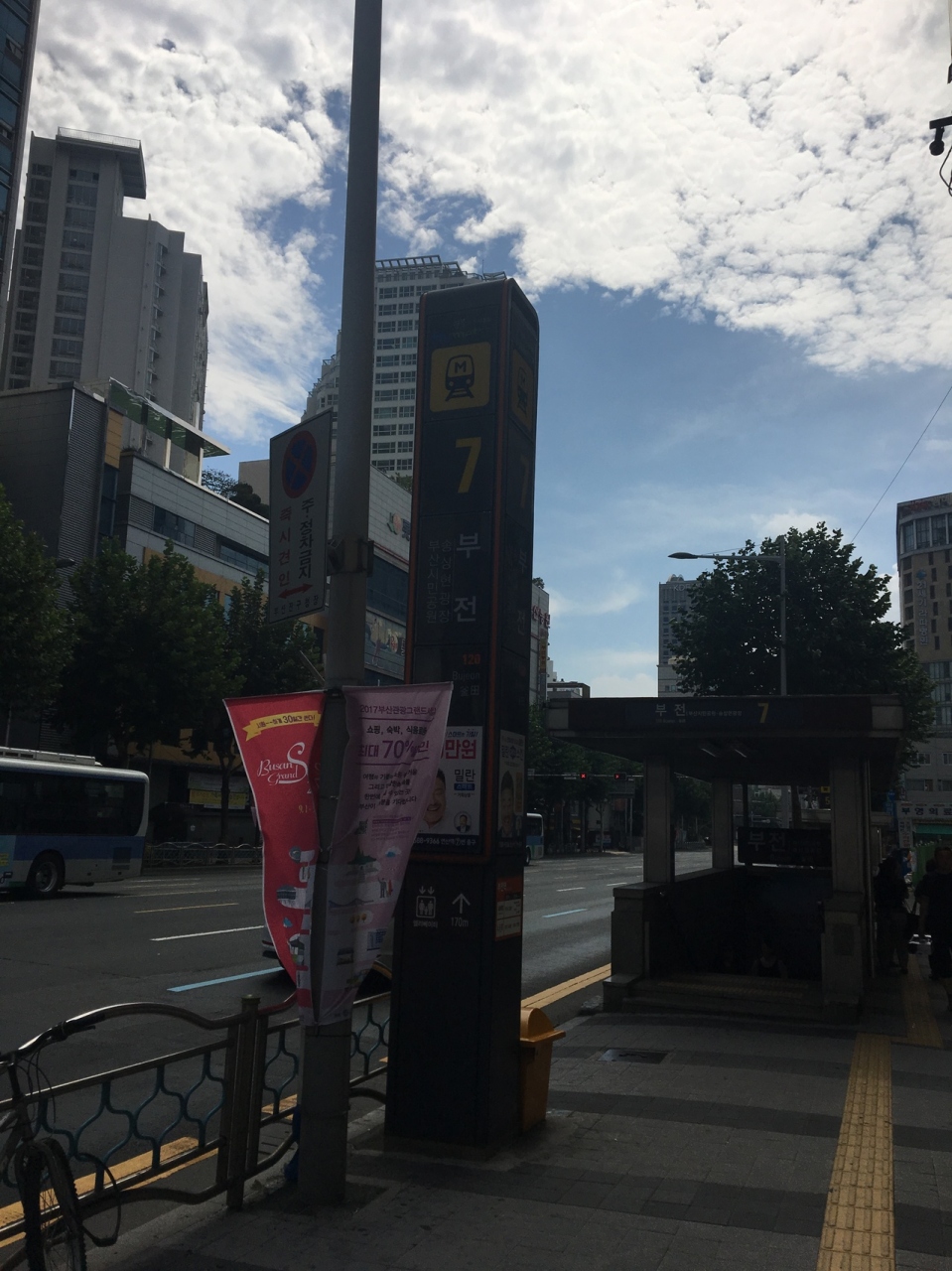 釜山市民公園に行った帰りに釜田駅から地下鉄に乗りました。こちらの駅までは公園から徒歩10分もかかりませんでした。駅のすぐ近くで大量のらっきょうや果物を売っているおばさんがいたり、散策してみると面白かったです。