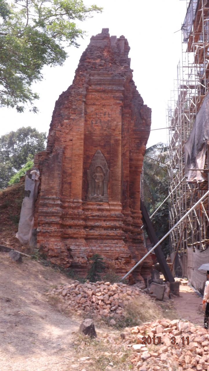 9世紀末に建てられたヒンドゥー教寺院だそうですが、その本体は修復中で、足場の骨組みと黒い布で覆われていました。隣の小さな塔には、三叉の矛を持ったドヴァラパーラ(門衛神)がアーチ型扉口に立っている彫刻が見られました。