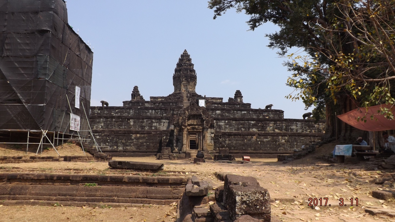 アンコール時代初のピラミッド型の寺院で、この形式がアンコールワットなどに引き継がれているのだそうです。中央の石段を登って行くと、周りは環濠と呼ばれる浅い堀のような水路と、深い森に囲まれているのがわかりました。