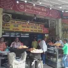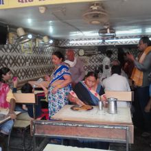 気軽に入れるスイーツ、スナック類もあるローカル食堂。13:00頃行きましたが結構な混雑ぶり、席が空いてなくて相席になりました。軽めに食べたかったのでプーリー2枚をオーダー(店先で揚げているので指を指しただけ)。間もなくしてプーリー2枚とかぼちゃのカレー、甘いシロップのようなものがプレートに乗せられやってきました。これで30Rs。食事というよりはおやつみたいなもんです。周りを見るとターリー(70Rs〜300Rsまでの4種類)を食べてる人が多かったです。食後のデザートとしてでしょうか、スイーツ単品の人もいました。おやつから食事まで手頃な値段で食べられる重宝する食堂だと思います。
