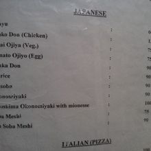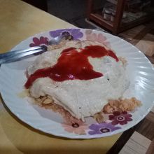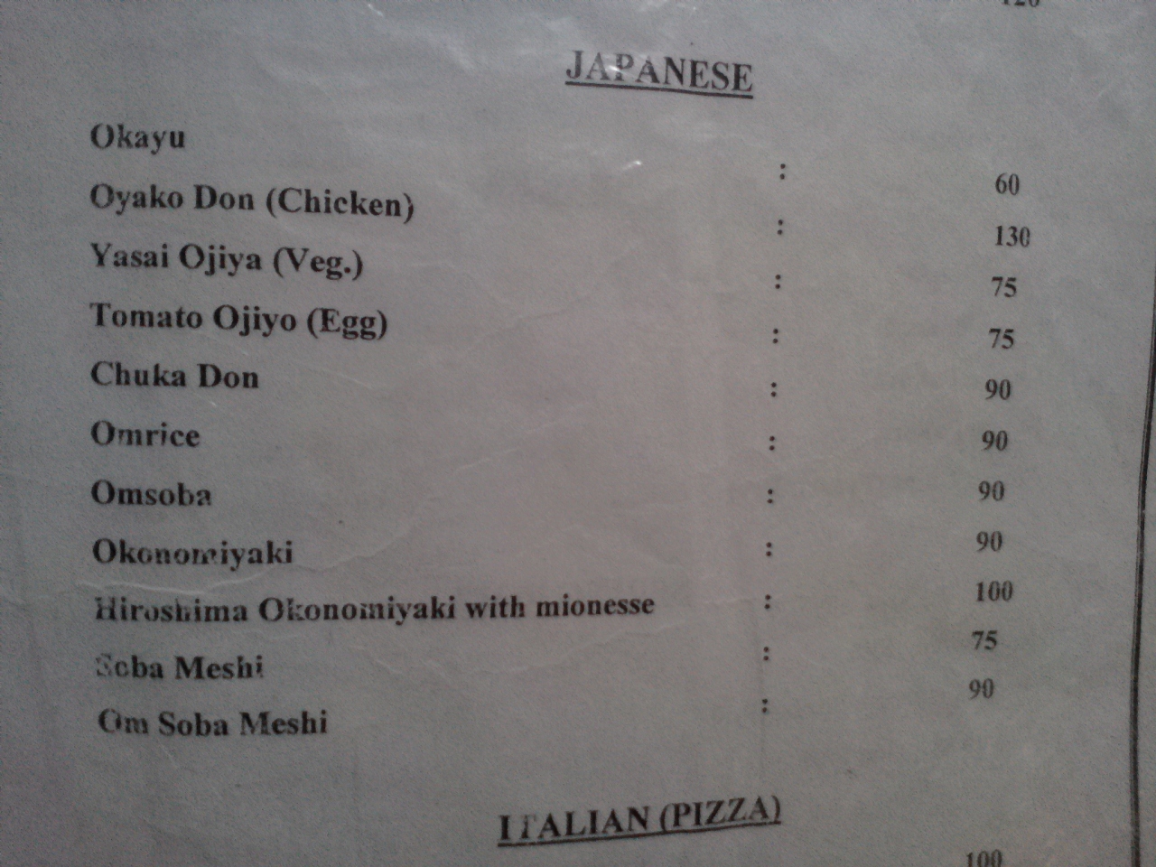 まさにパッとしない、いかにも流行ってなさそうなツーリストレストランです。入るのをためらう人がほとんどではないでしょうか。そこをあえて“潜入”してみました。メニューには日本食の欄も。しかし、この店の雰囲気からしてどれも地雷度が高そうに思えたので値段的にもリスクの低そうなオムライス(90Rs税なし)をオーダー。店員が運んで来たときに「いただきます」と言われました。お前が食べんのか?というツッコミはおそらく理解されないだろうと思いやめときました。料理はオムライスというよりは目玉焼きオン・ザ・ケチャップライスという感じ。目玉焼きといっても肝心の黄身の部分が見当たらず全部白身に見えました。謎です。味は…いまふたつ。ケチャップライスがかなりオイリーでご飯の臭いもきつく、かなり無理をして食べきりました。見た目通りのイケてないレストランです。