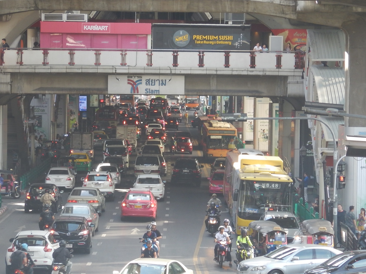チットロム駅からサイアム駅までスカイウォークを歩いたみた。下のラーマ1世通りはいつも渋滞している。サイアム駅はBTSのシーロム線と スクンビット線の乗り換え駅で、ホームの幅が広く、2階建てと他の駅には見られない構造になっている。