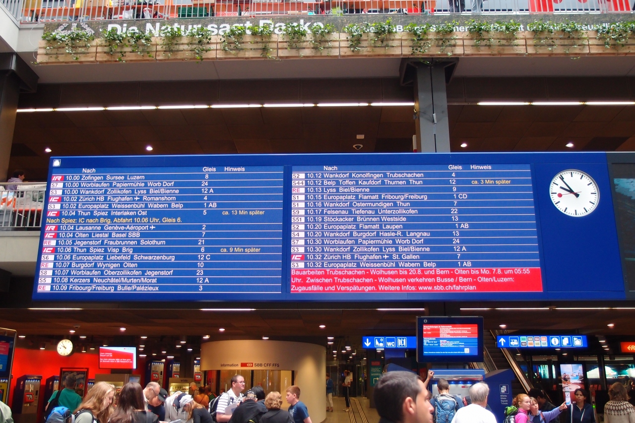 旧市街に近くて便利な場所にあります。構内には大きな電光掲示板があり、乗車する列車のホームがわかりやすかったです。チューリヒから約1時間、ツェルマットへはフィスプ乗り換えで約2時間30分でした。