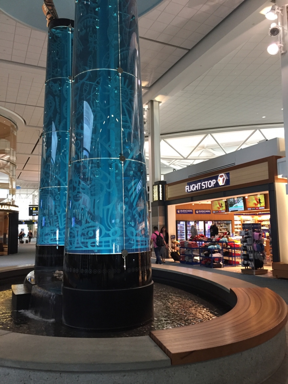 さすがカナダ西部の玄関口にあたる空港だけあって、とても大きく、便数もすごく多いです。しかし、乗客の動きはわかりやすく、はじめてでも迷うことなく利用することができました。ターミナルビル内にいくつかある、いかにもカナダというオブジェは、なかなかおもしろいです。